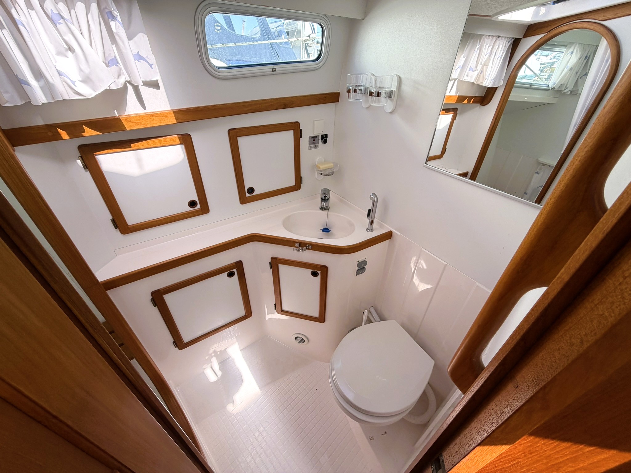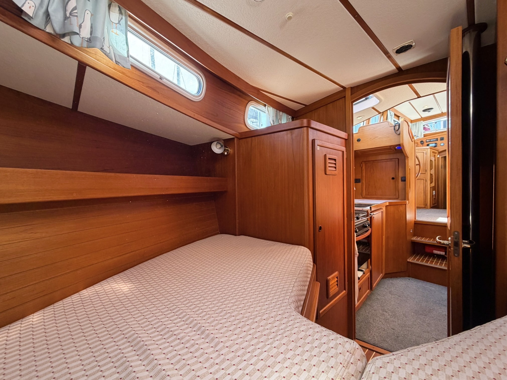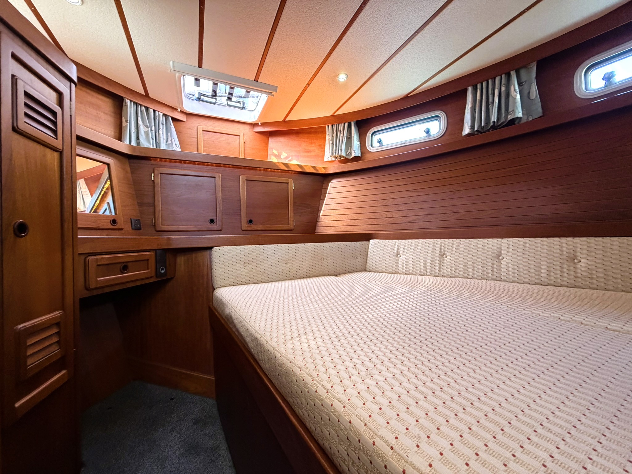 Configured with a custom 2-cabin, 2-head interior layout based on the ‘Live-on-board’ layout option, but with the addition of an aft ensuite heads and a large forward V-berth.