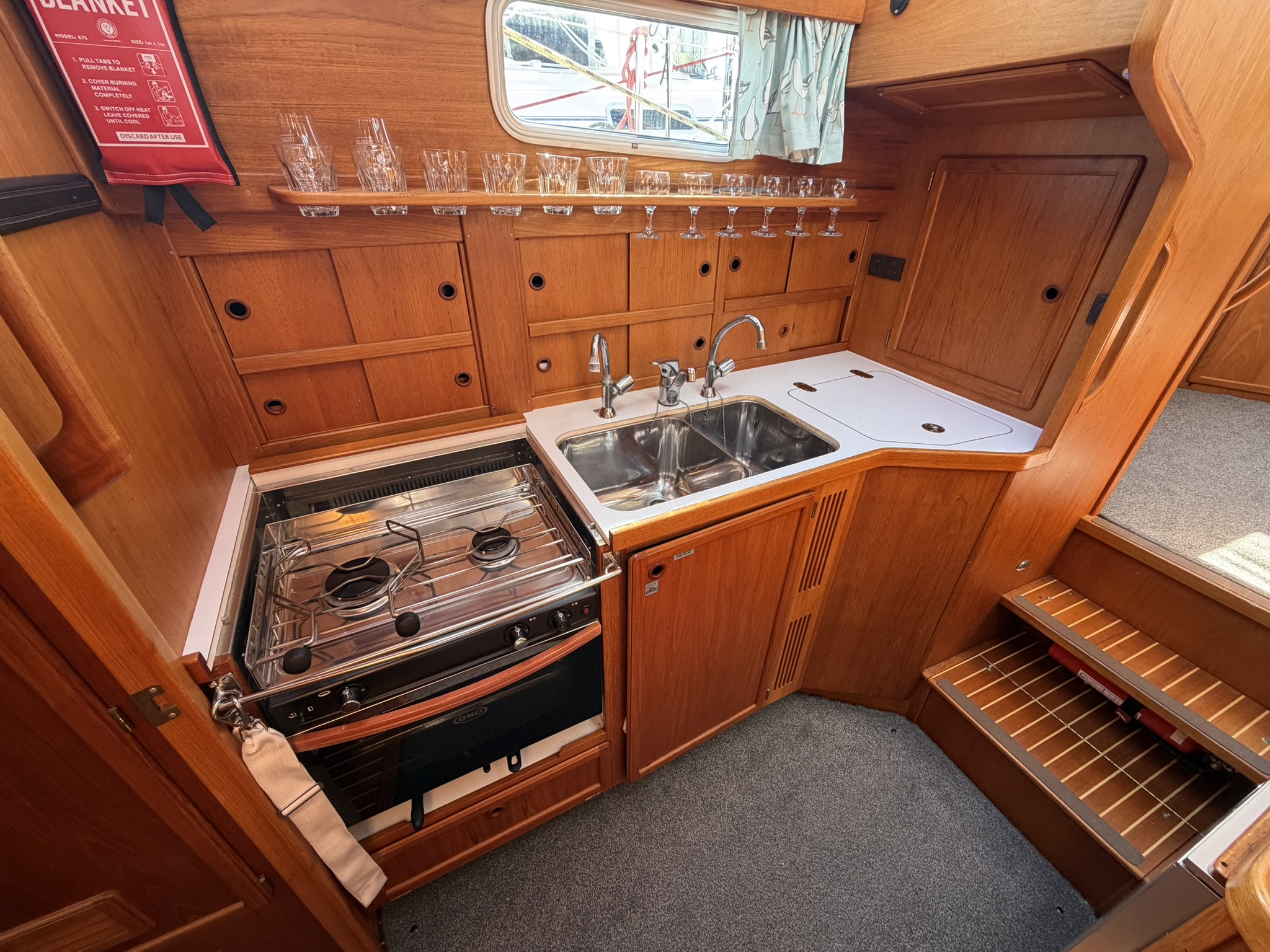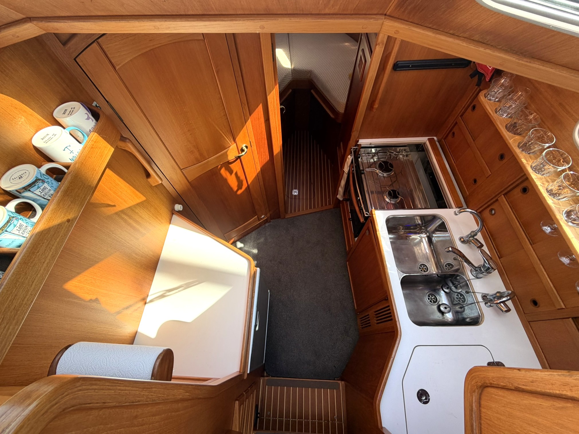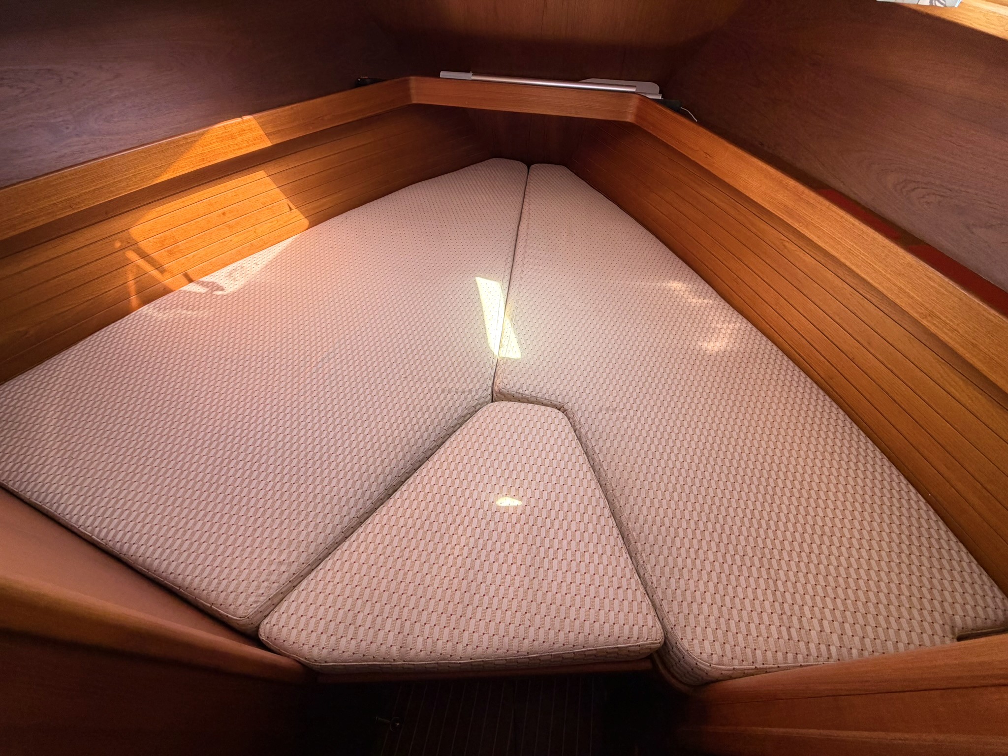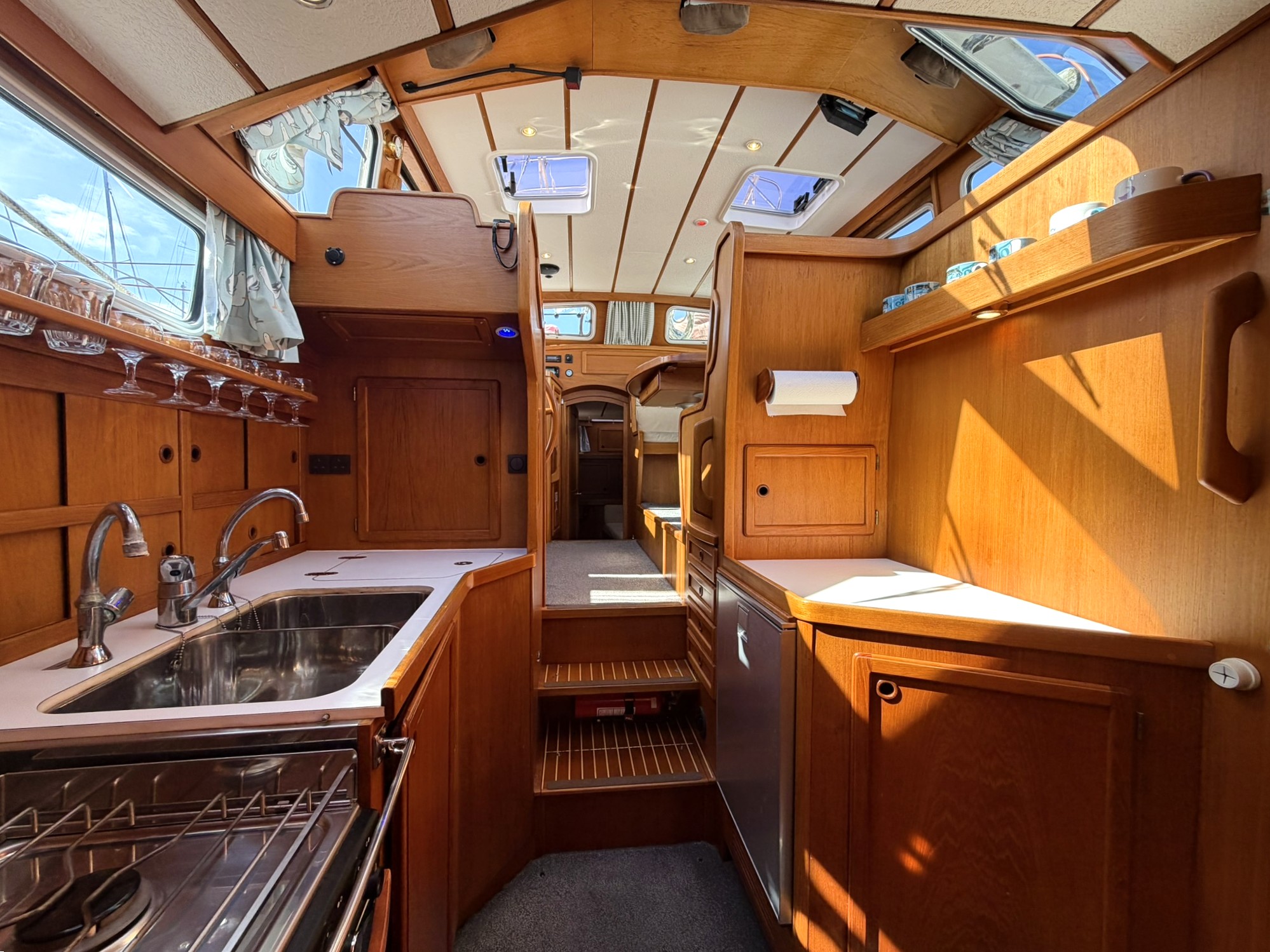 Satin varnished teak interior joinery.