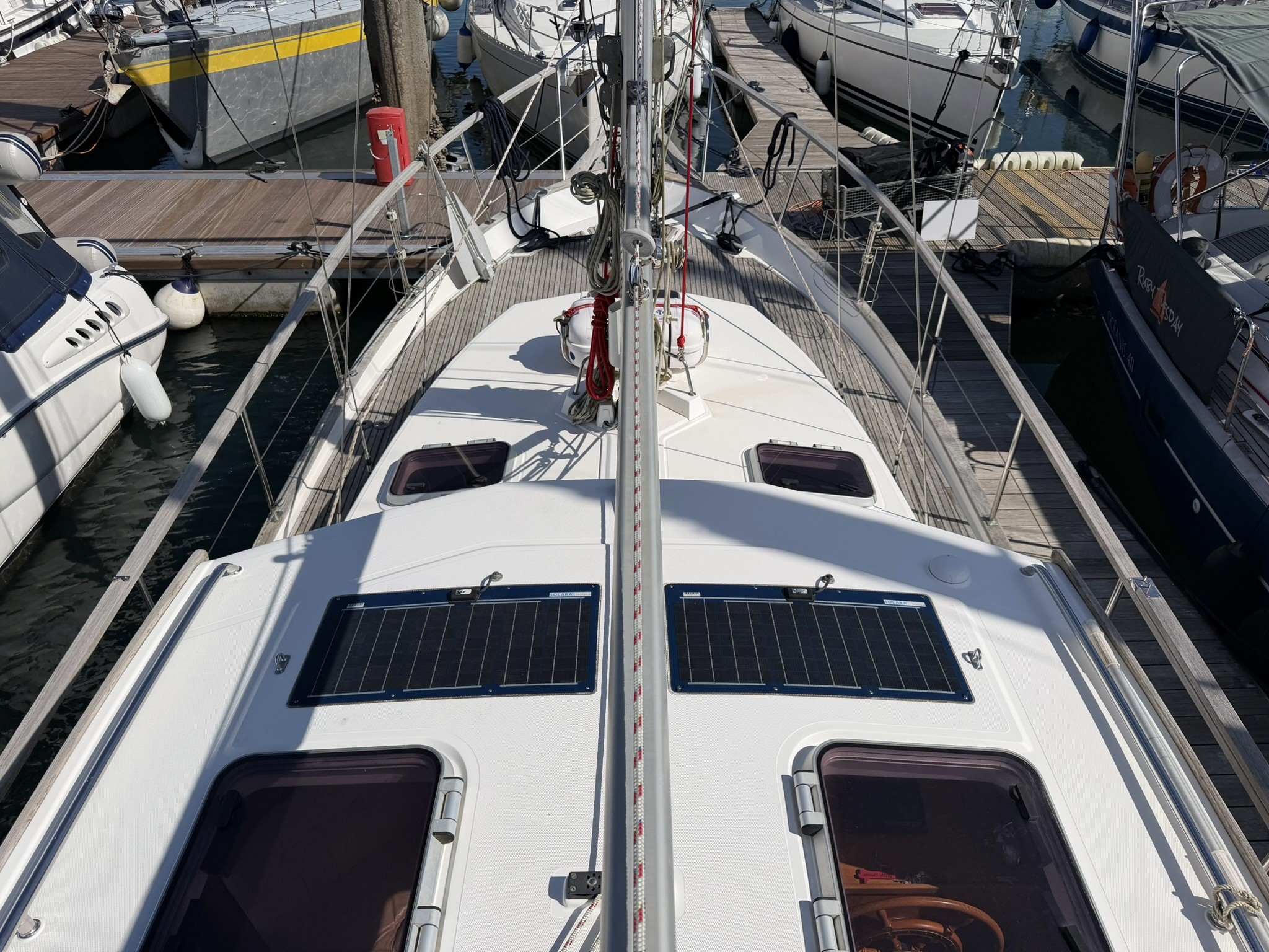 Selden silver anodised aluminium spars with internal halyards.
