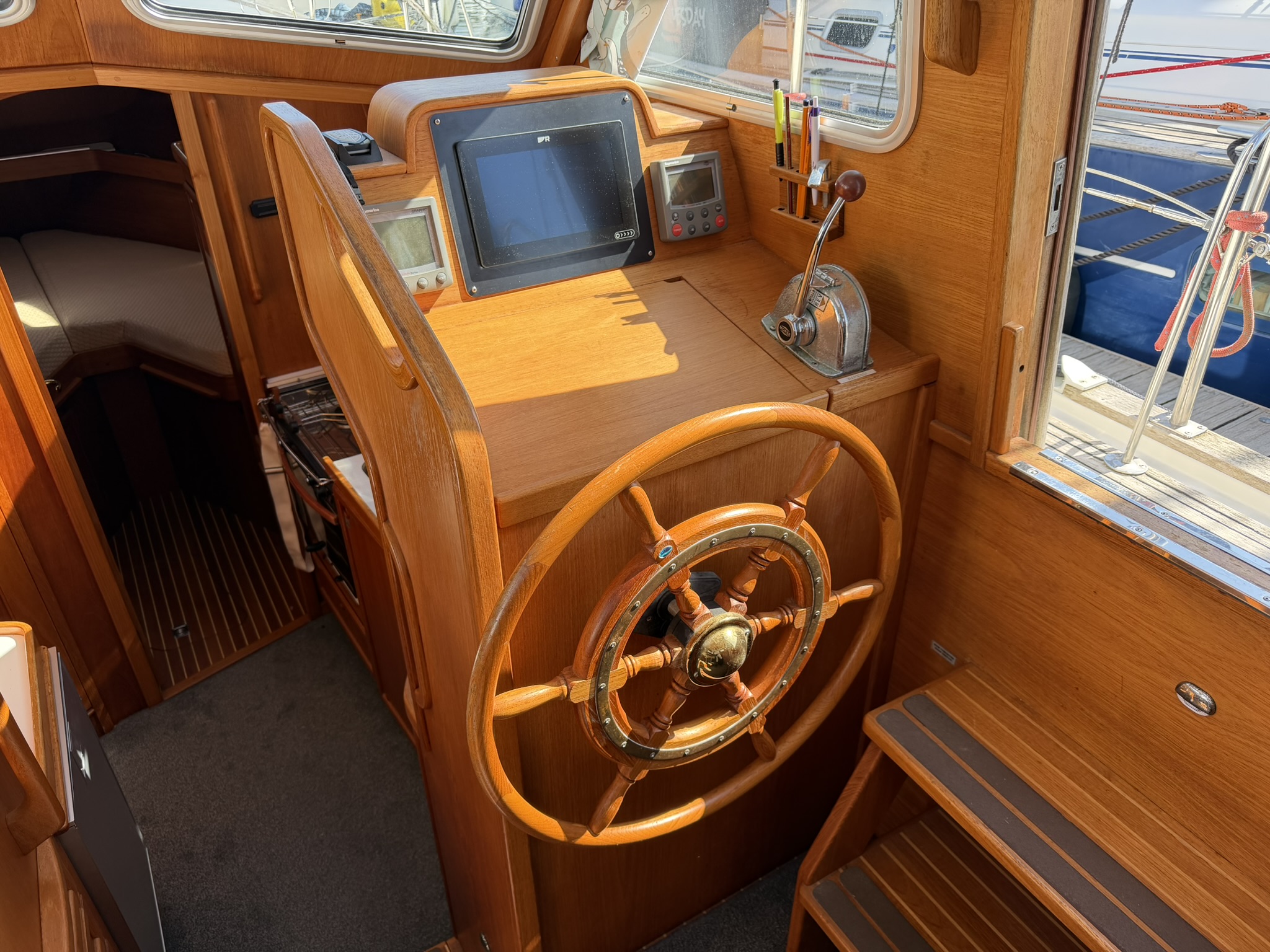 Stazo wooden wheel at lower helm.