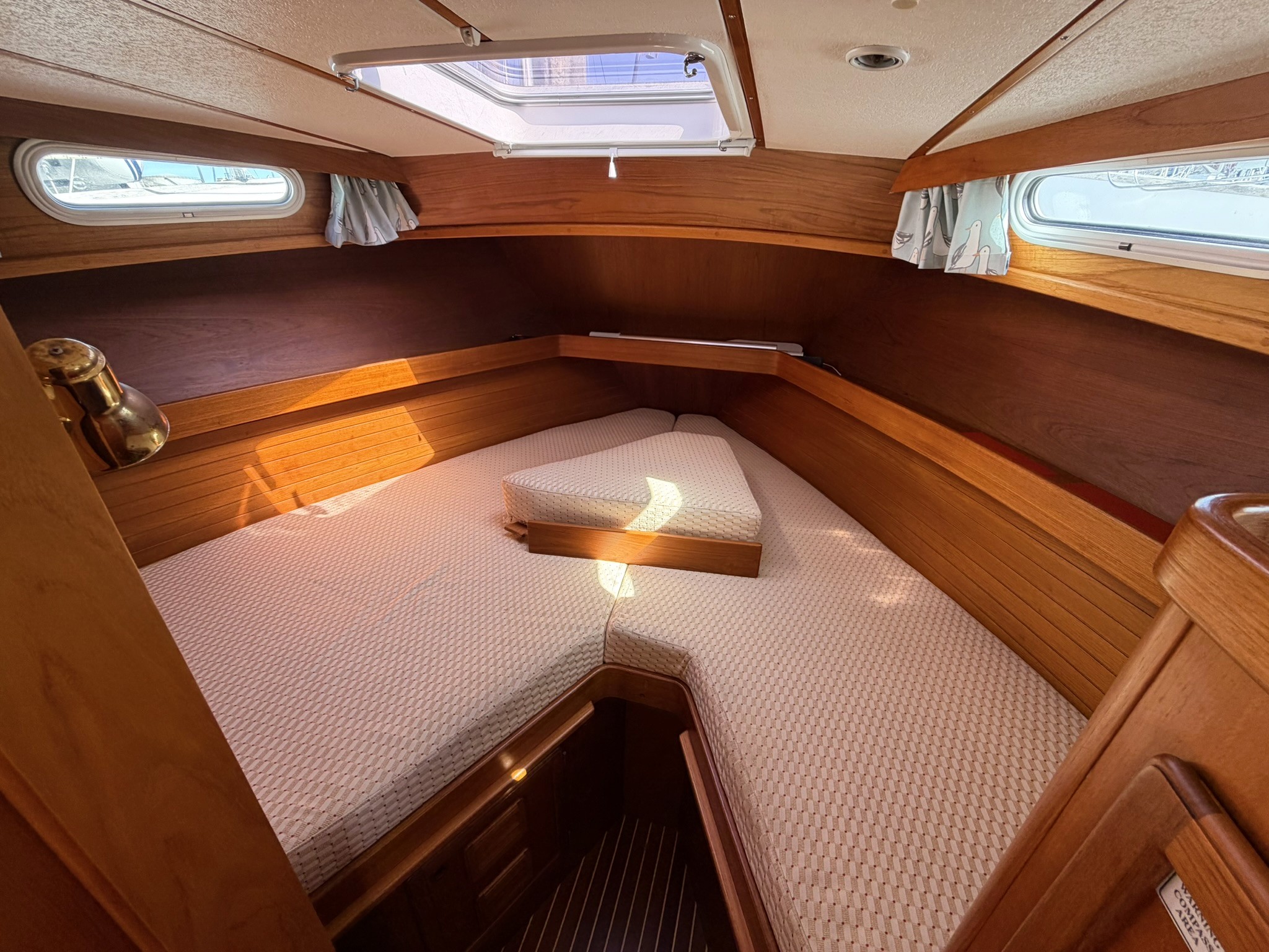 Large V-berth with infill and storage under.