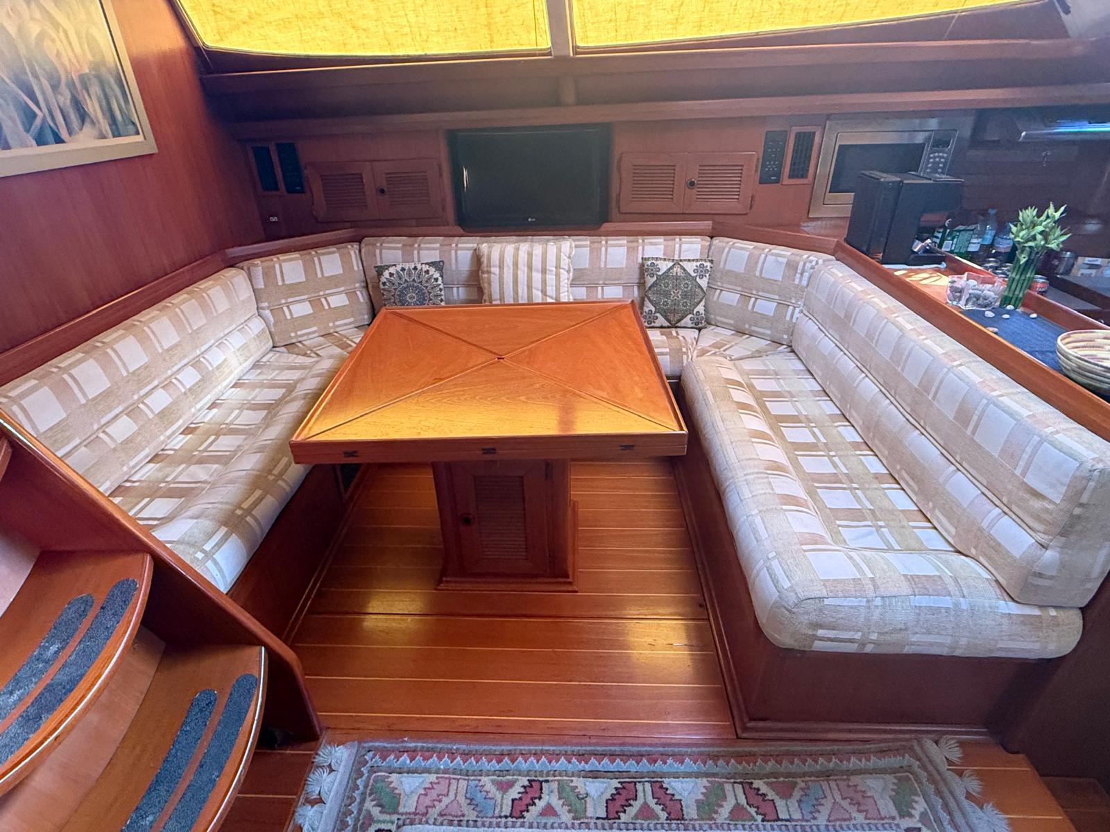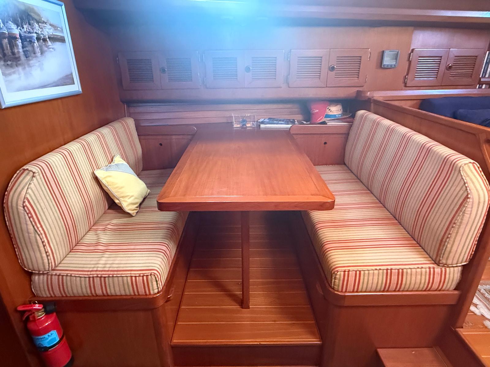 The spacious saloon is separated into two areas with the main seating and dining area aft and the galley forward and down two steps with dinette to starboard.