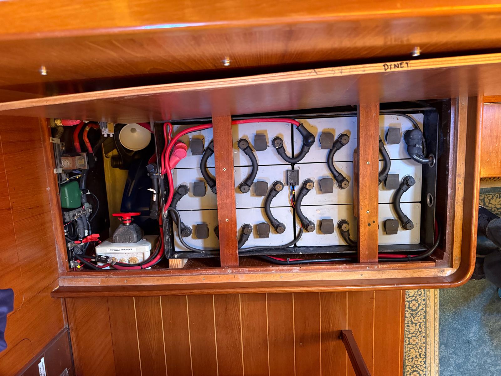 The interior woodwork is in satin varnished teak. Cabin soles are in teak and holly