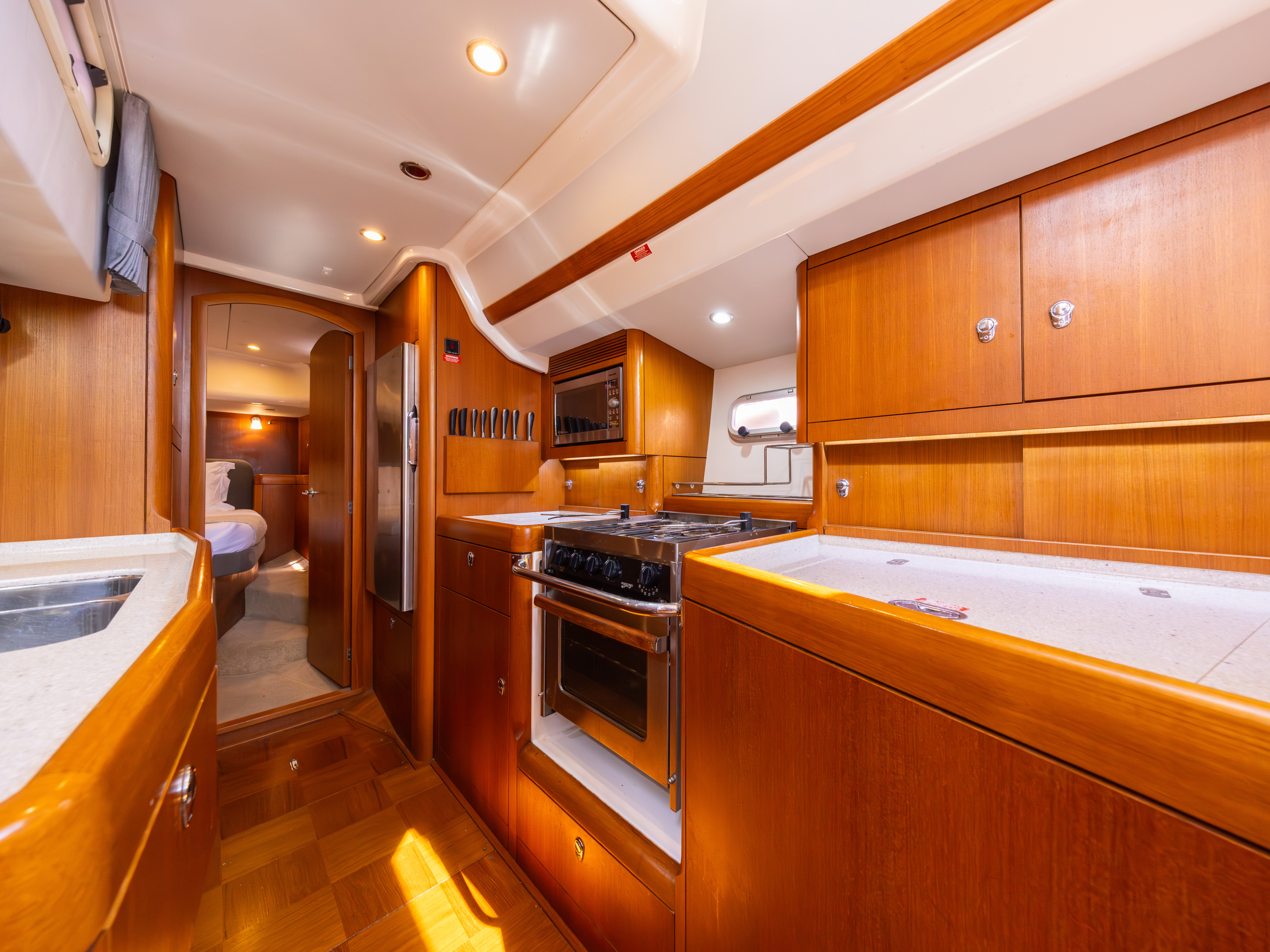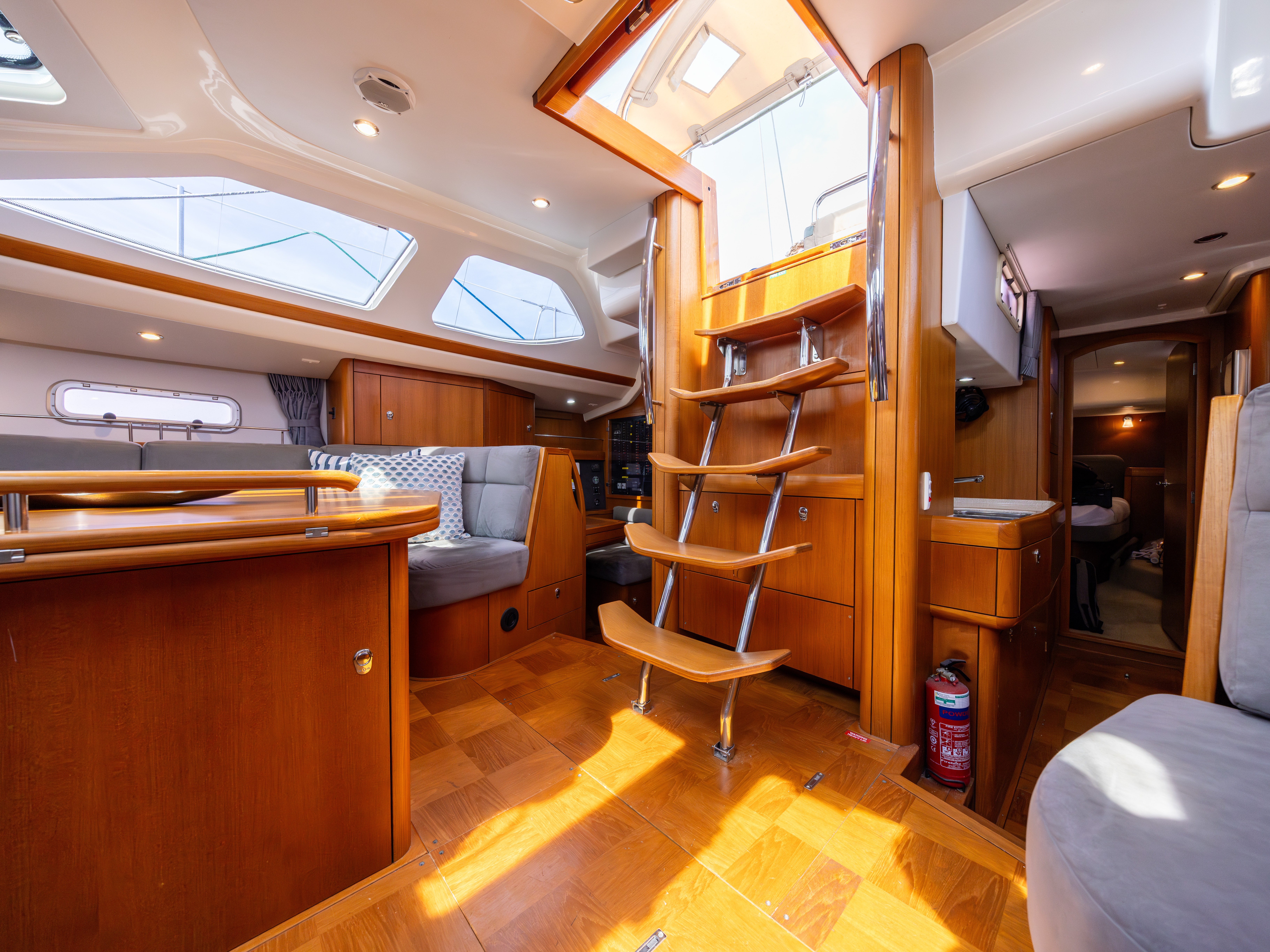 Chequerboard style teak cabin sole