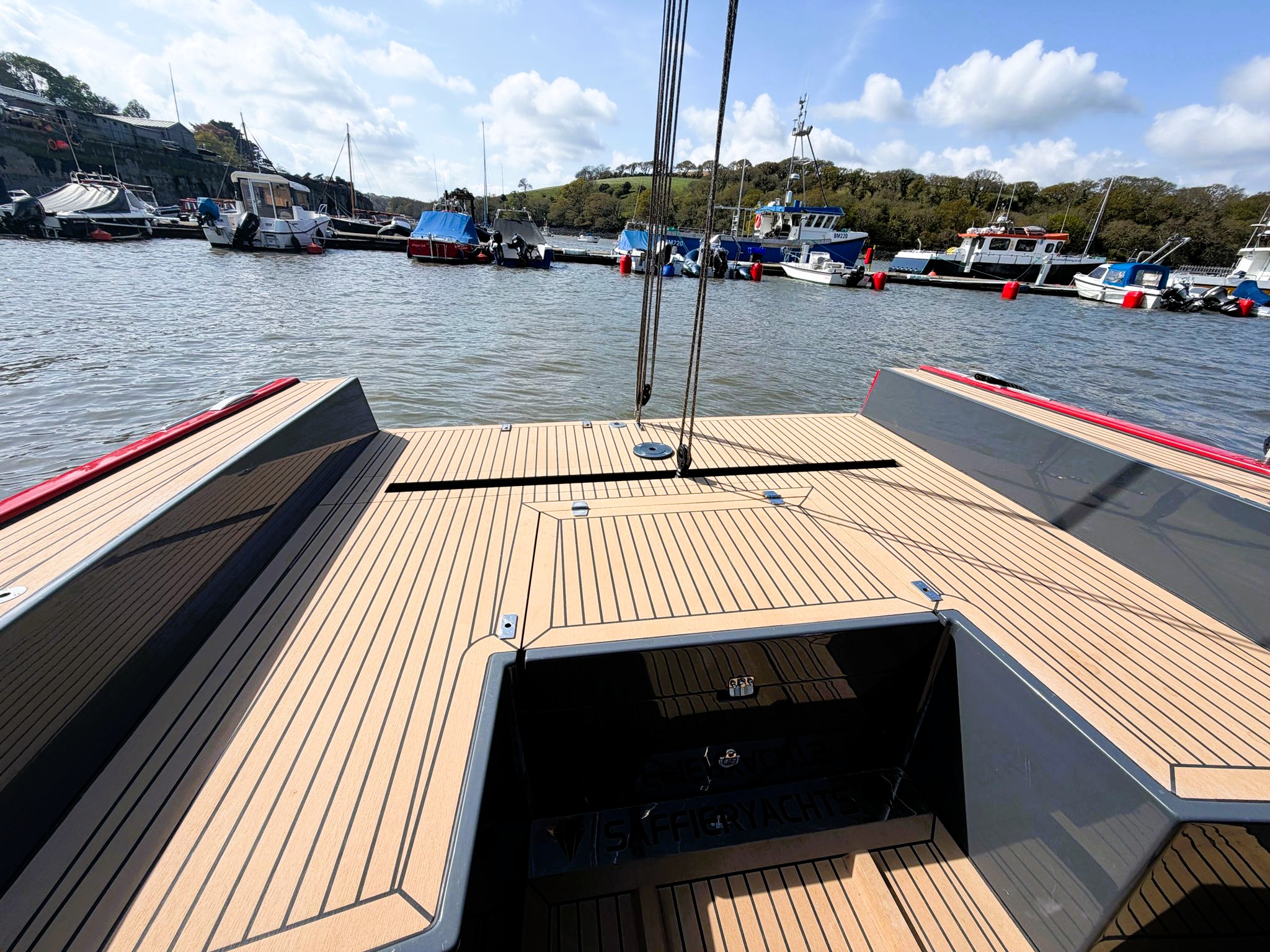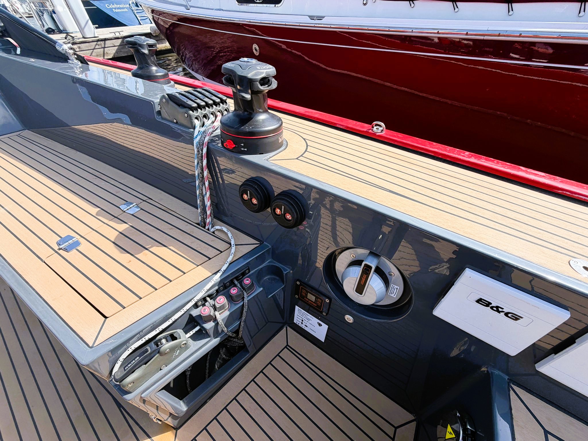 Esthec nautical decking in cockpit, deck, seating and toe rails: biscuit colour with black caulking