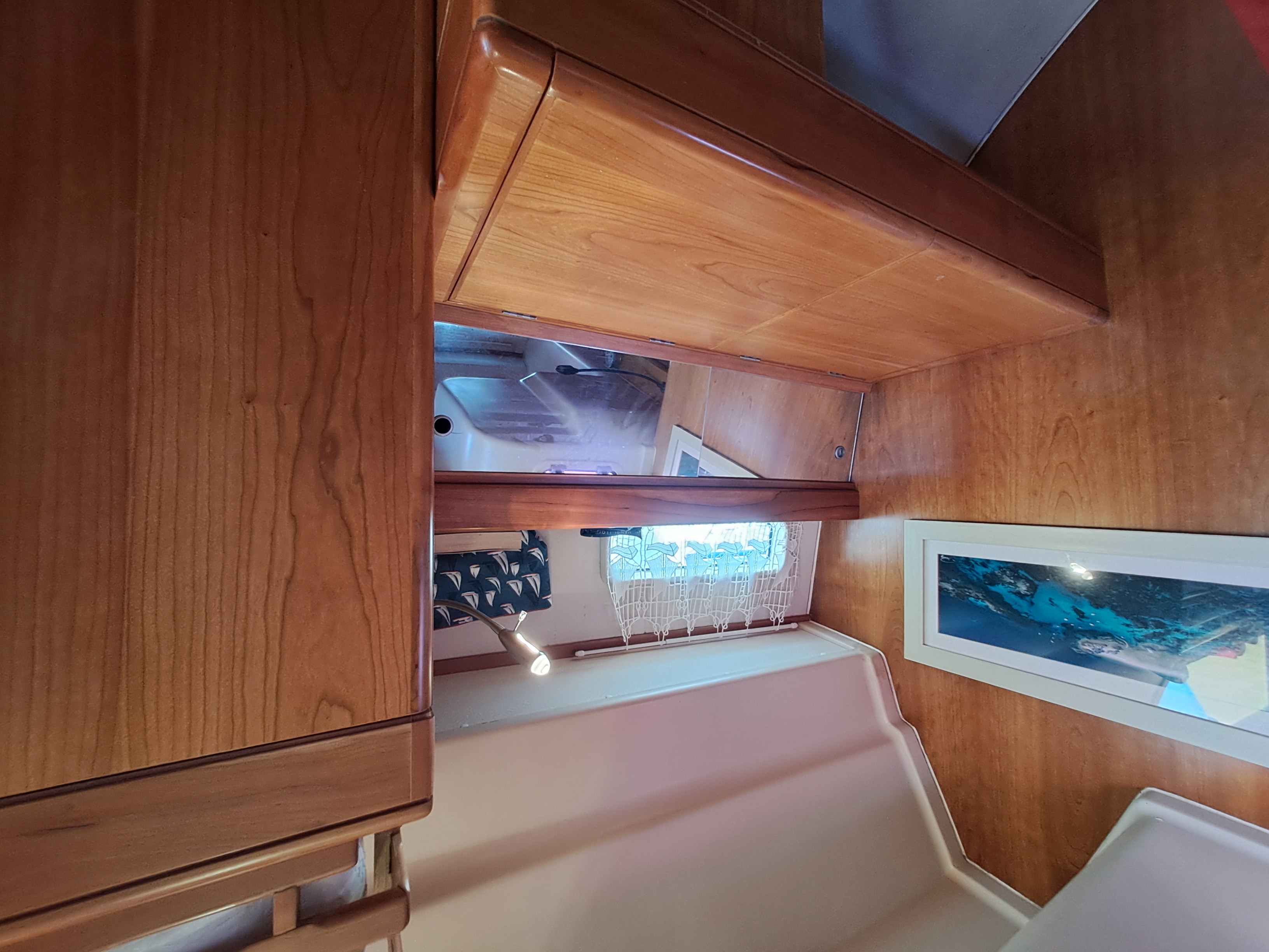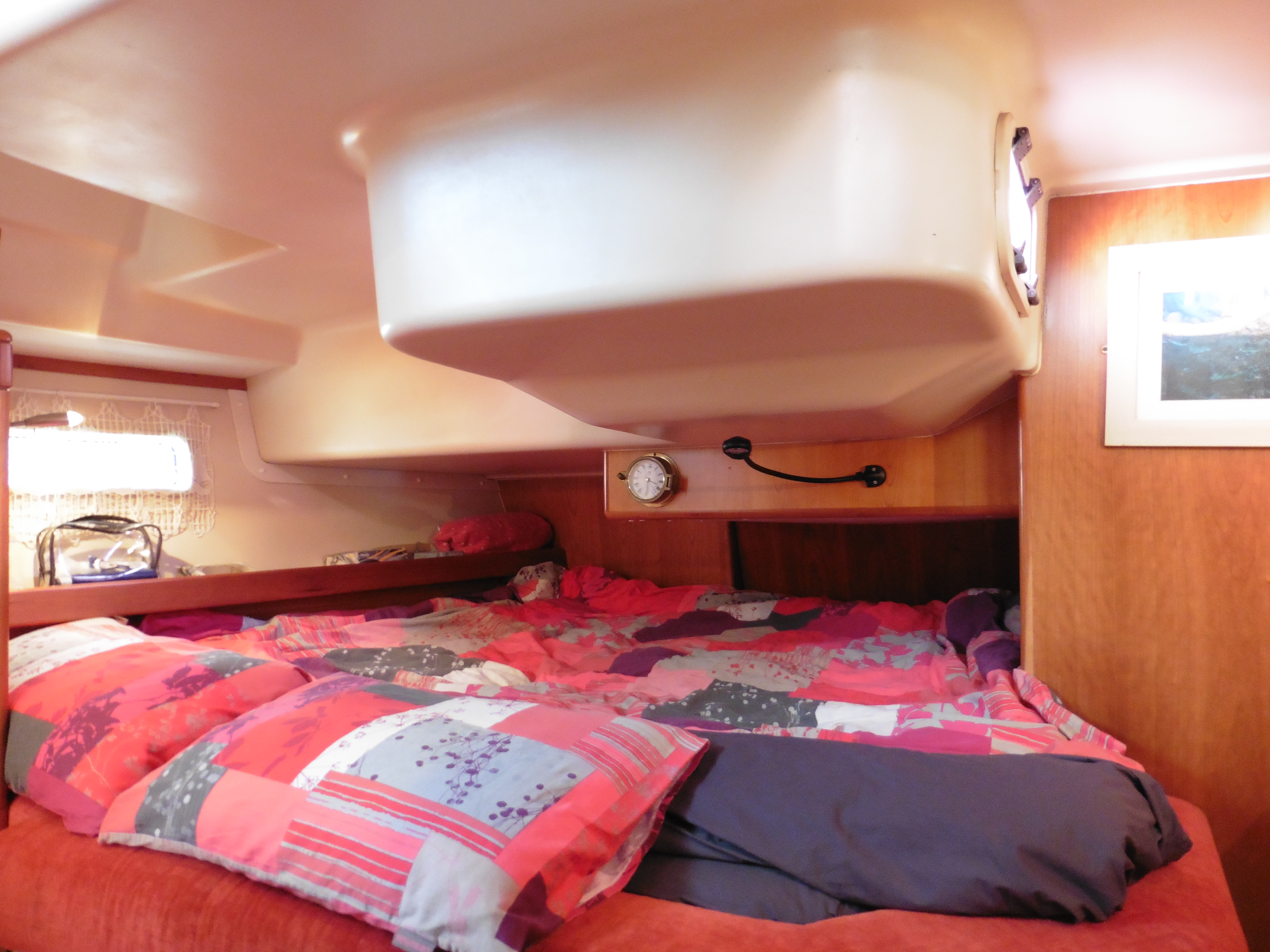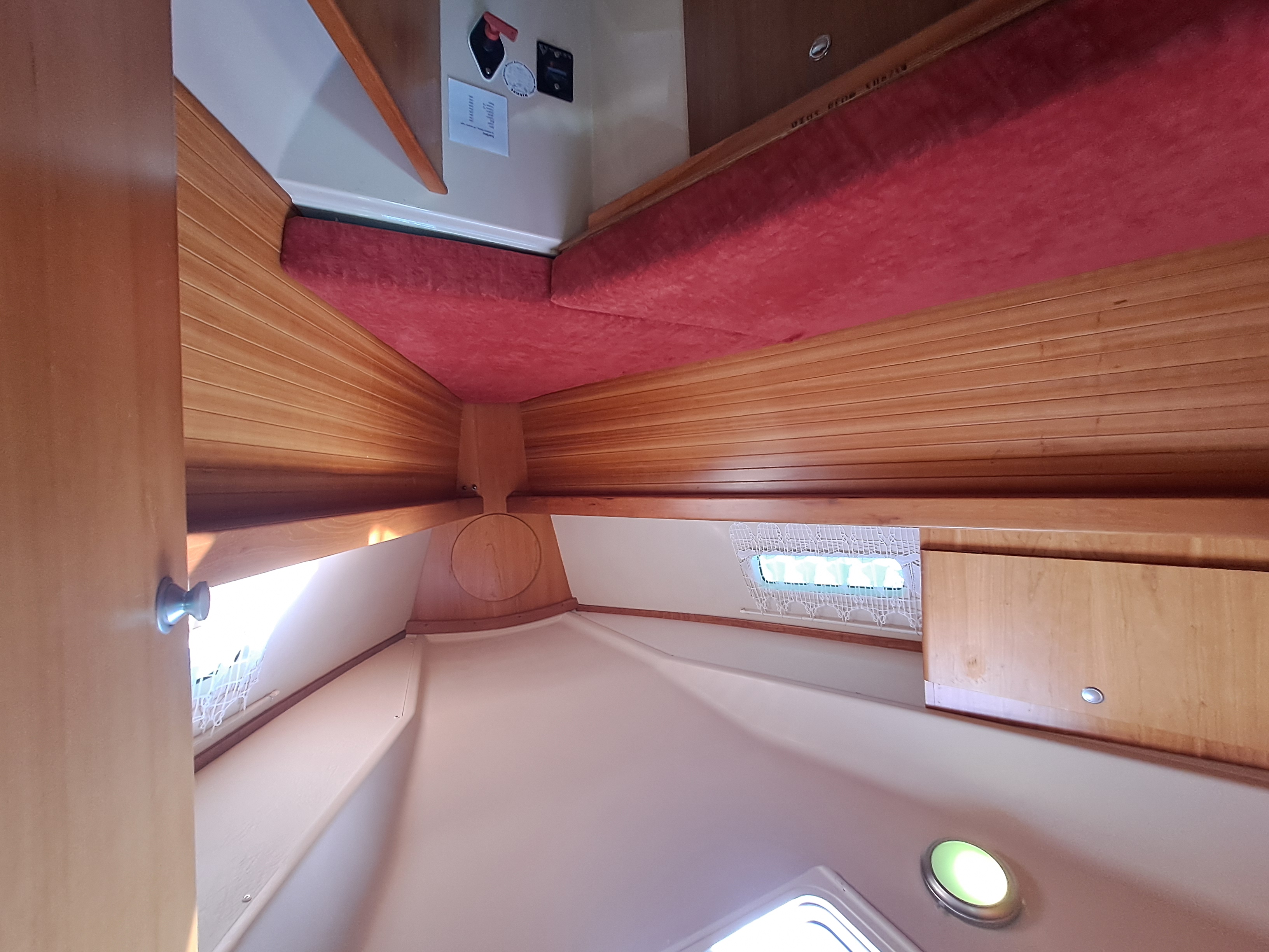 Opening forward hatch, Fixed side ports with curtains, single or double berth conversion with sliding section, hanging locker with shelving,12v lights