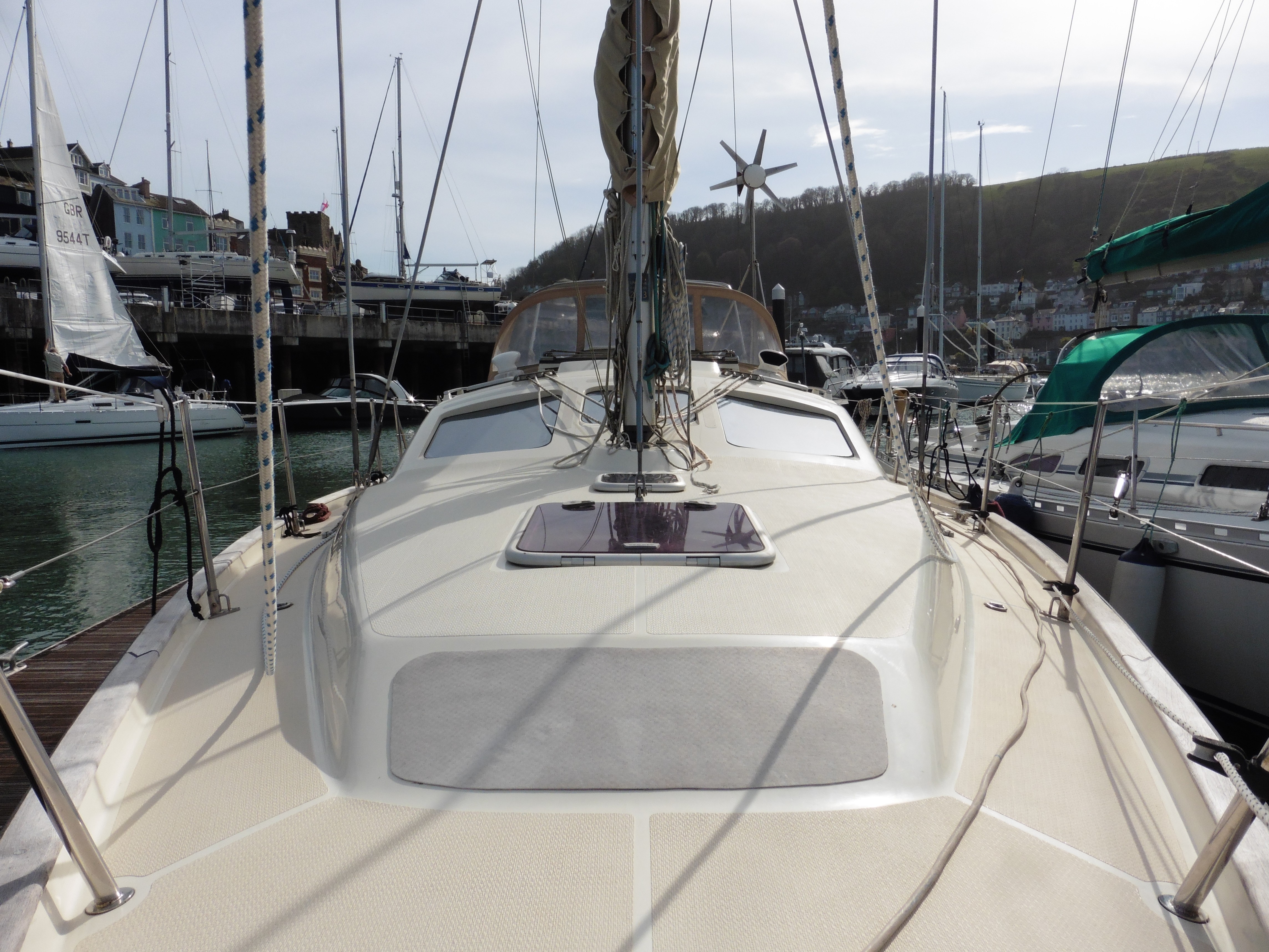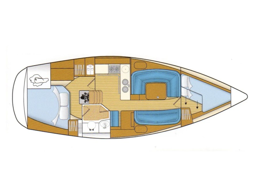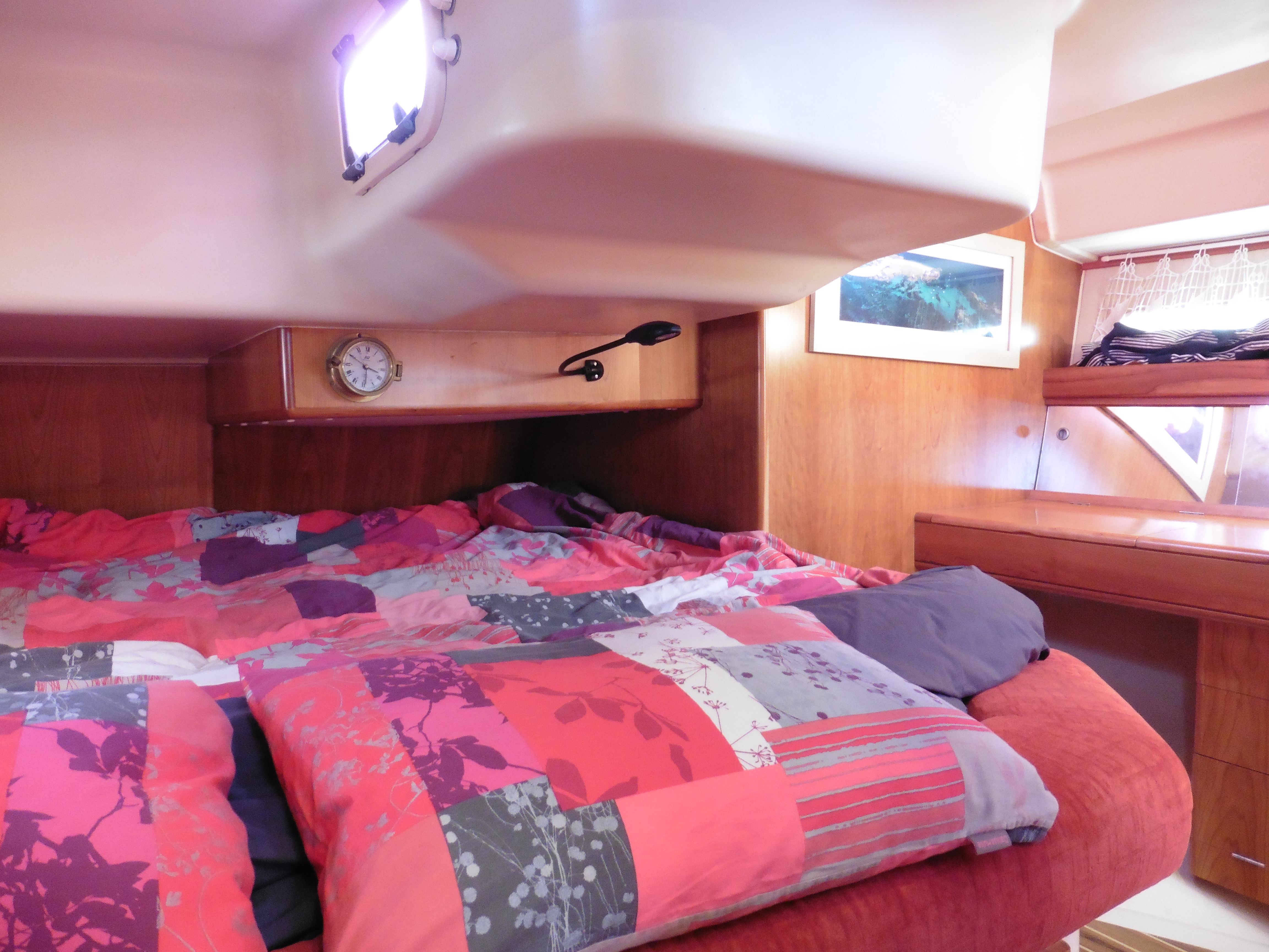Opening forward hatch, Fixed side ports with curtains, single or double berth conversion with sliding section, hanging locker with shelving,12v lights