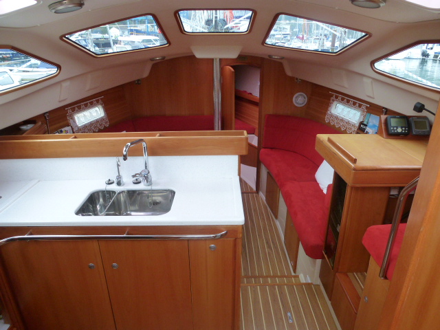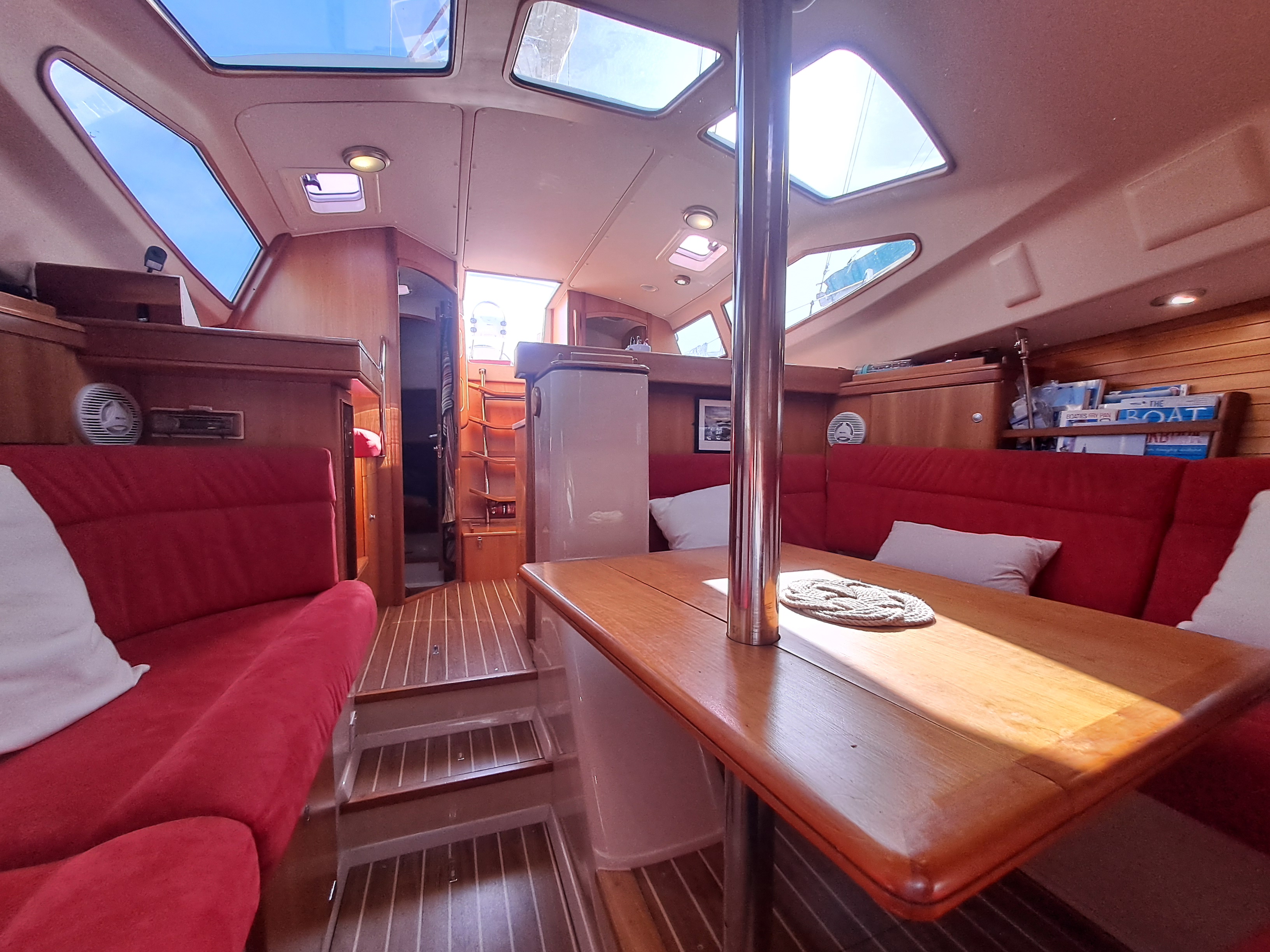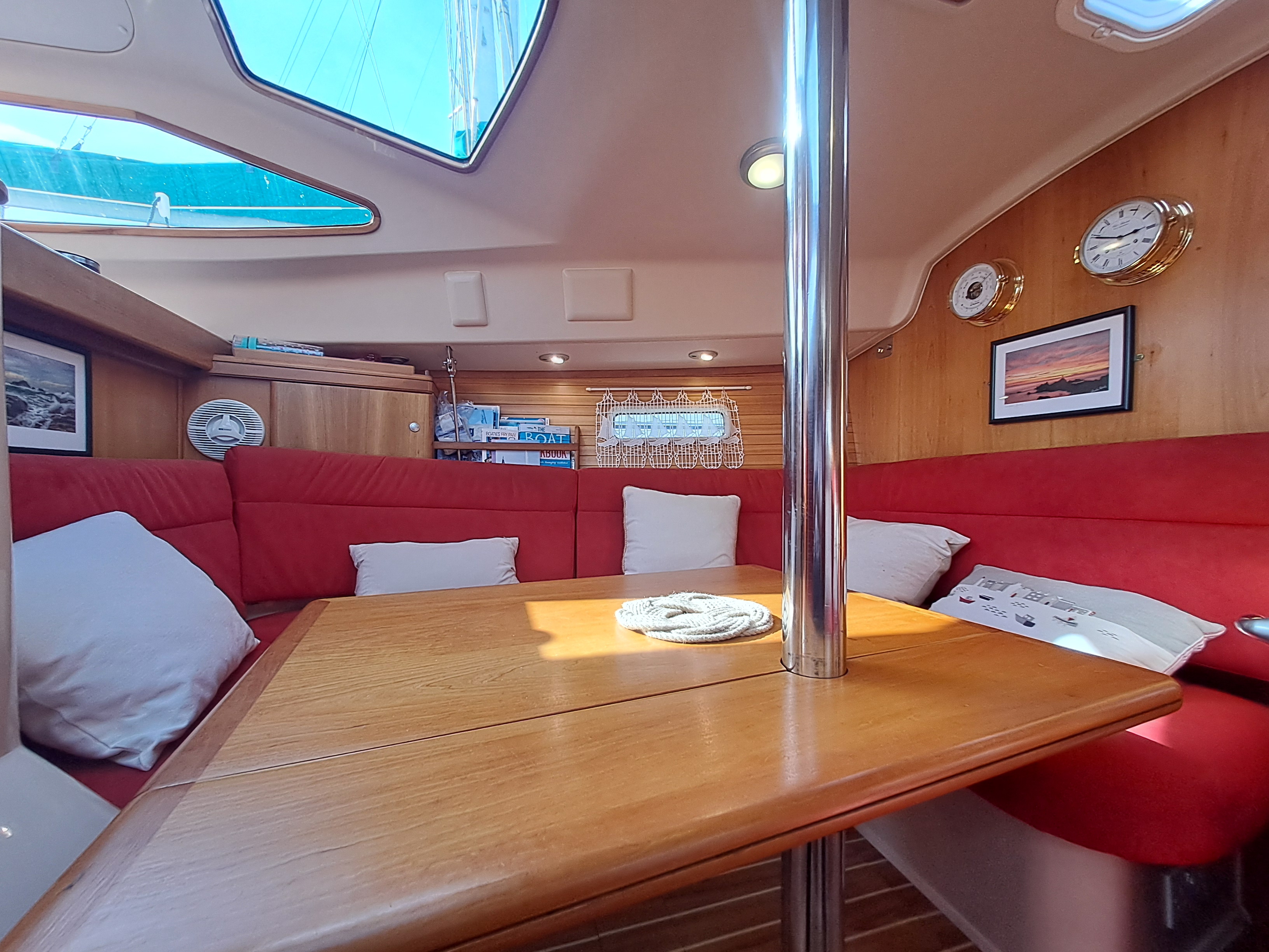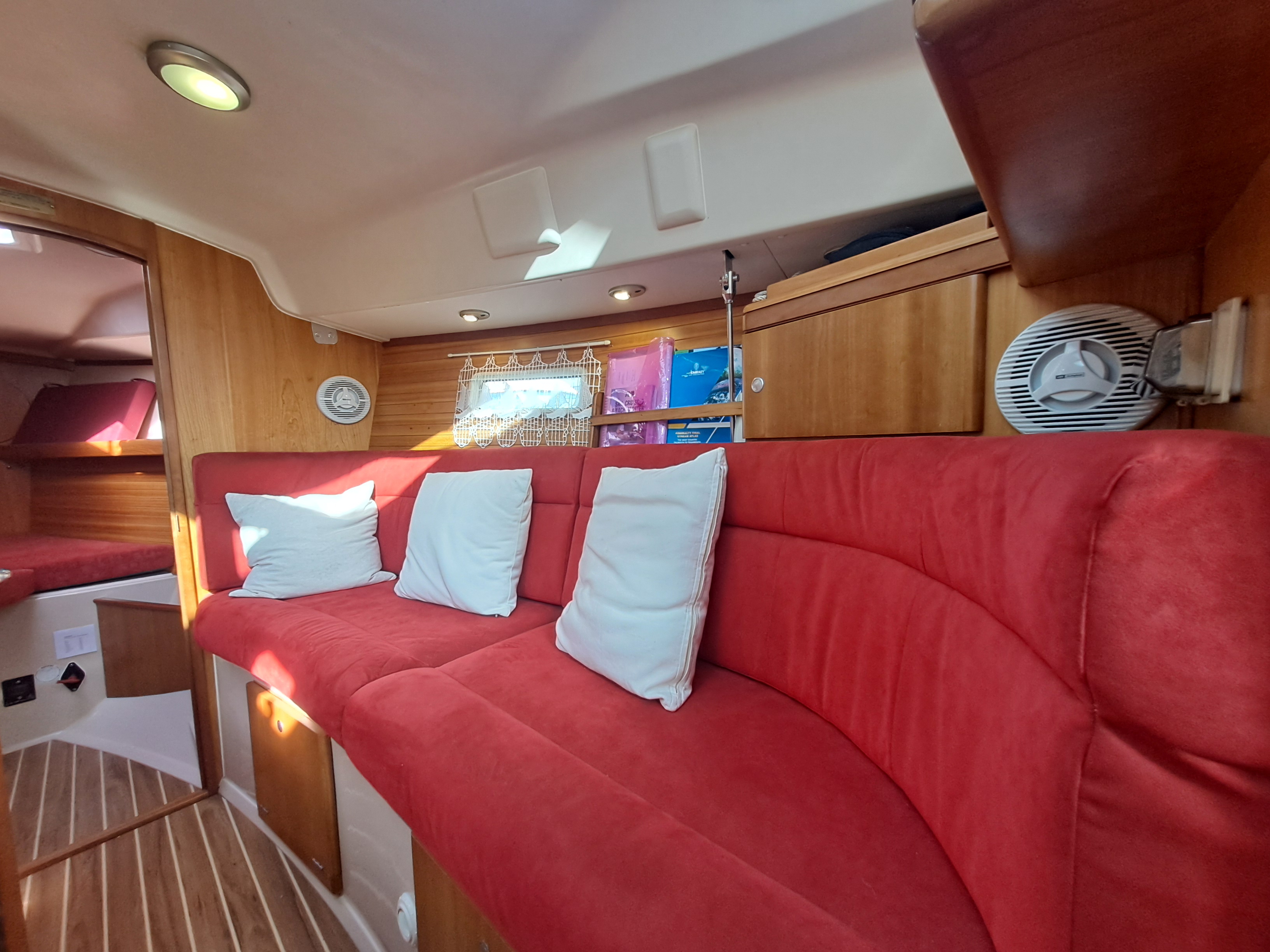 Opening deck hatch, Side ports with curtains, Storage lockers, U shaped settee to port with lockers below, Saloon table extends to seat 6 + people, Table drops to create a double berth, Settee berth to starboard with storage below, 12v lights, 240v Sockets