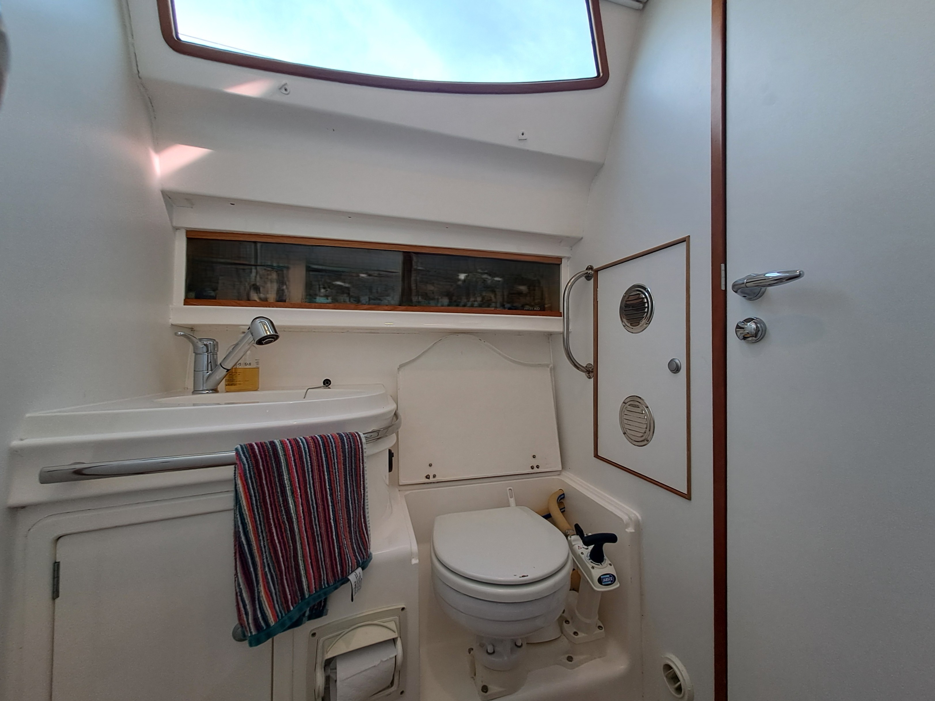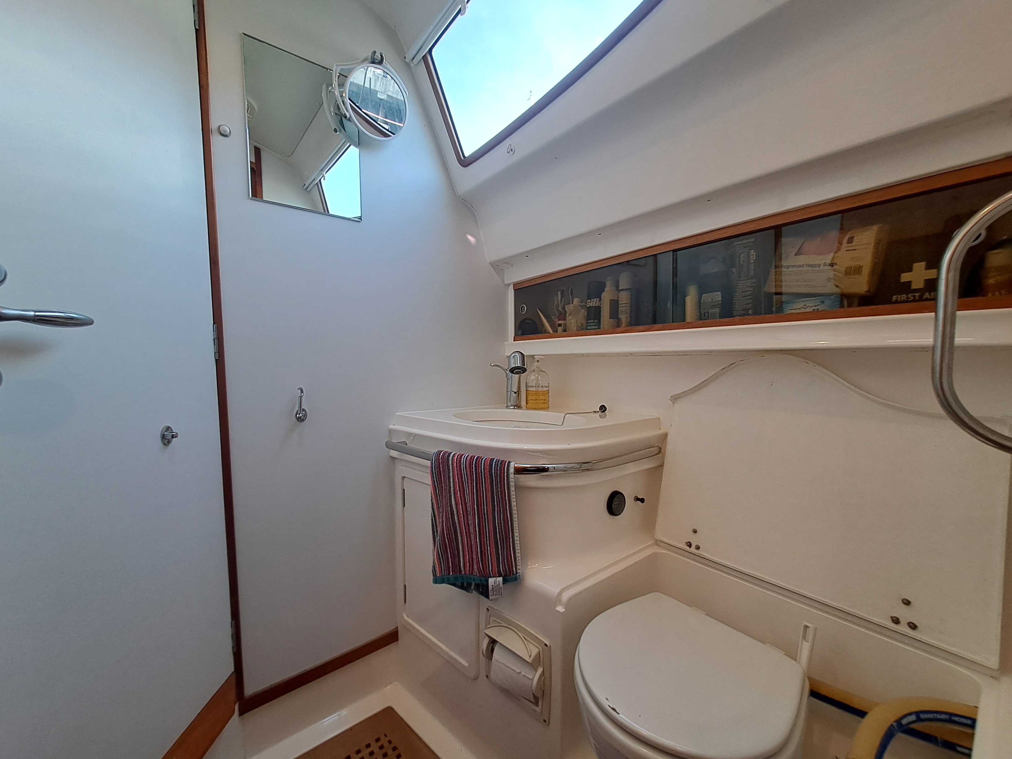 Moulded washbasin with hot and cold water, Mixer tab doubles as a shower head, Storage lockers, teak shower grate, shower sump pump, Jabsco marine toilet with shower seat cover with upgraded larger bowl, 12v light, Ensuite access to aft cabin, opening hatch