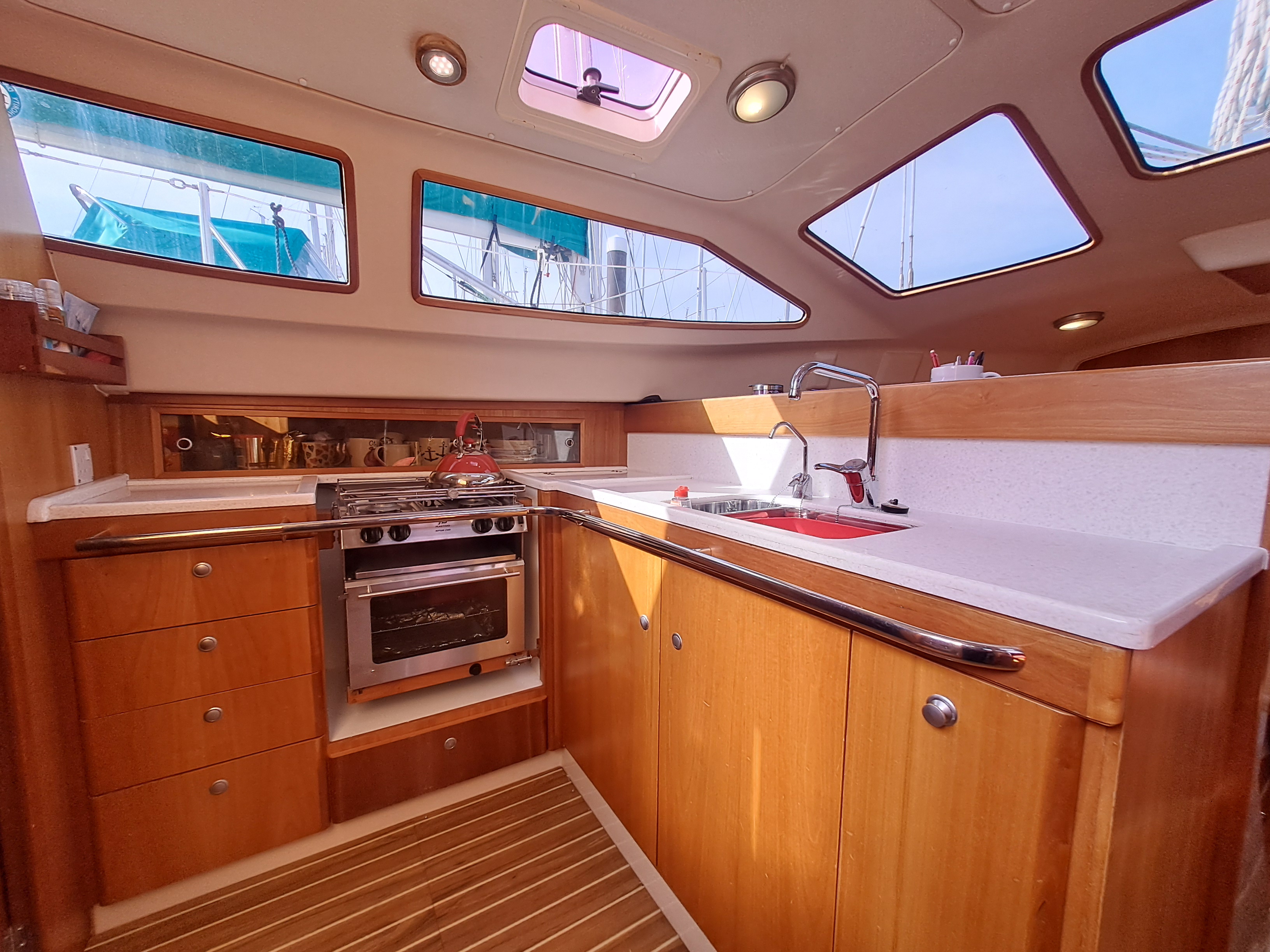 Small deck hatch, Large L shaped white Corian work surface, Lockers and storage, Gimballed 2 burner Neptune 2500 gas cooker with grill and oven