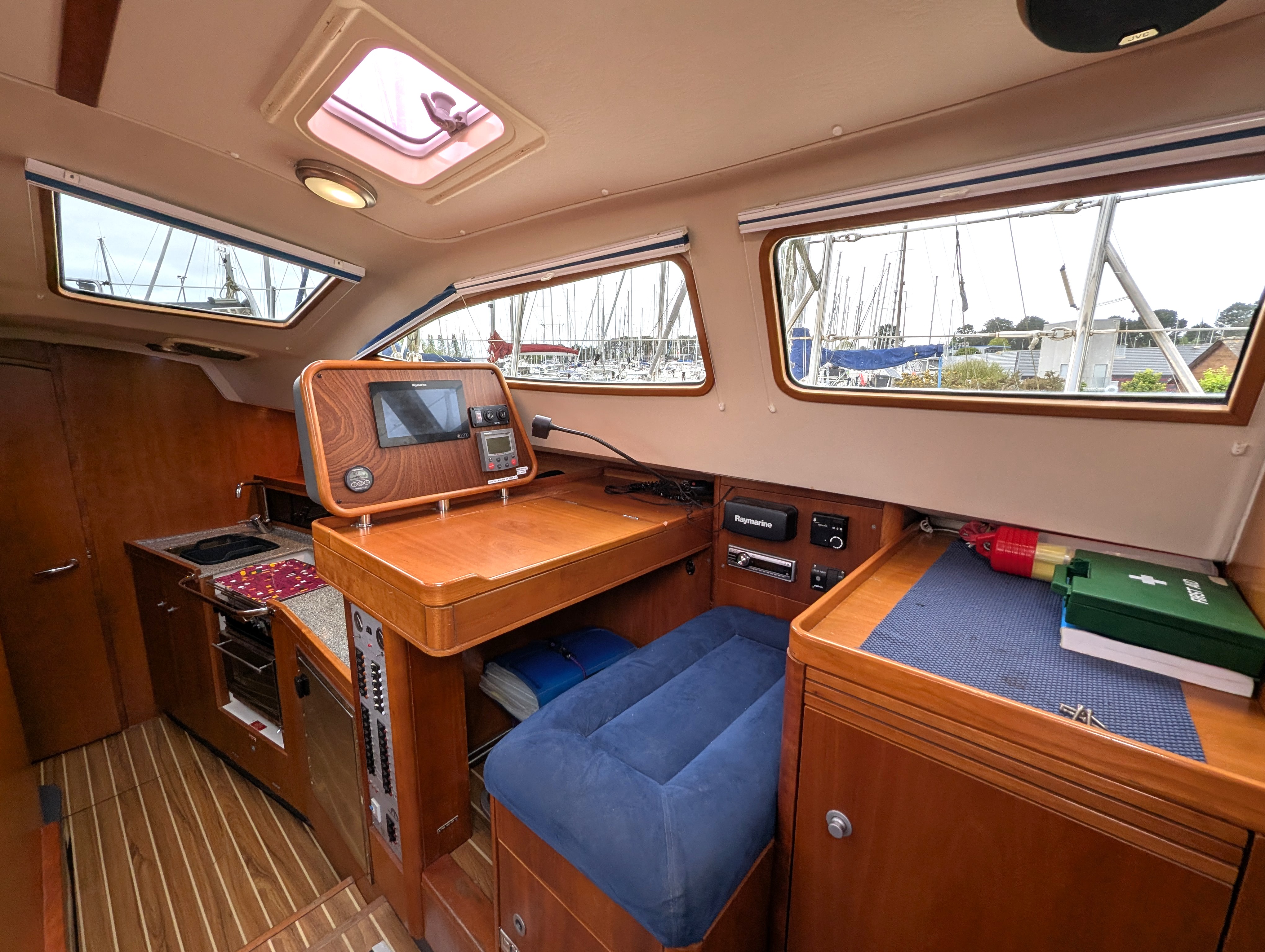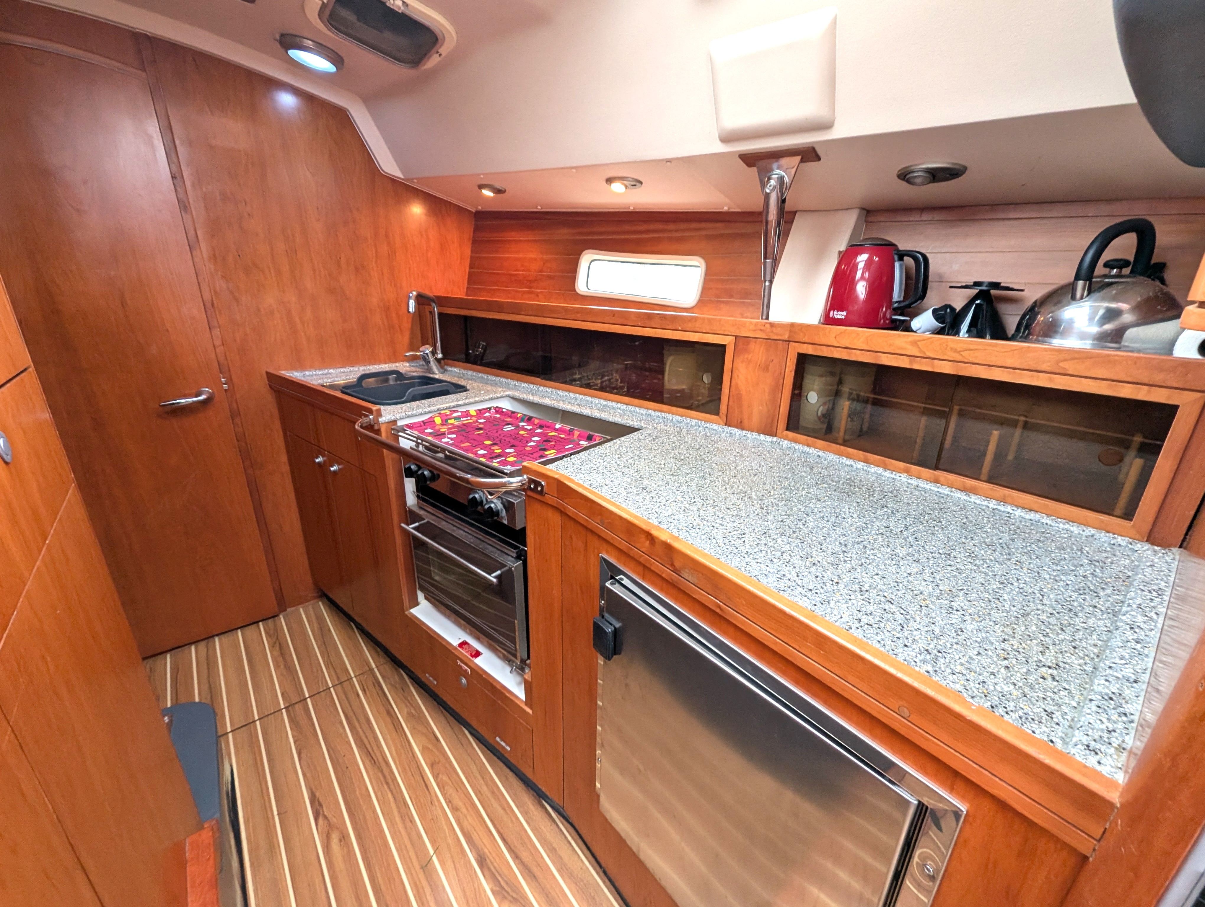 Forward and to starboard with Stainless Steel fridge, 3-burner gas hob with oven and grill