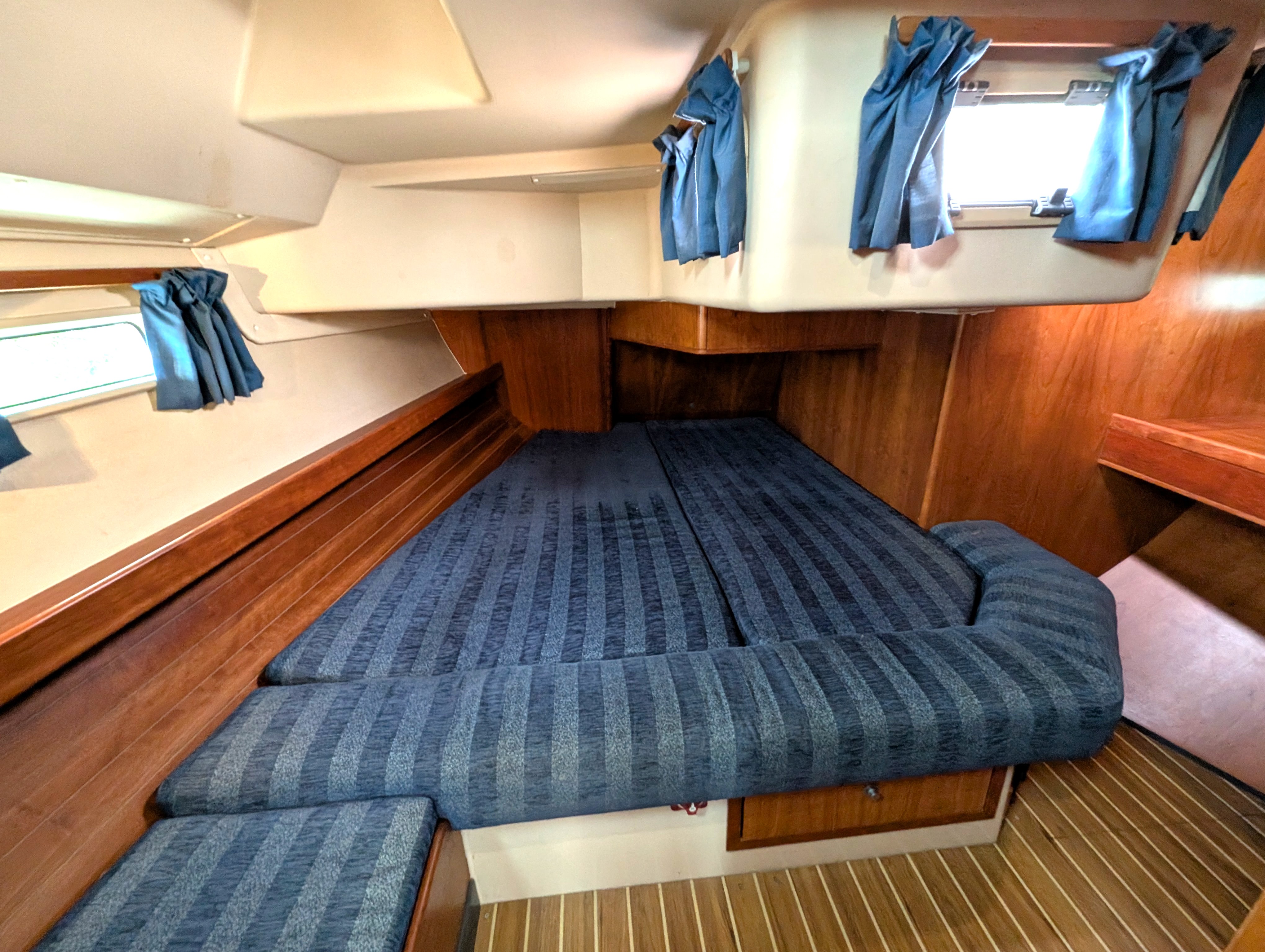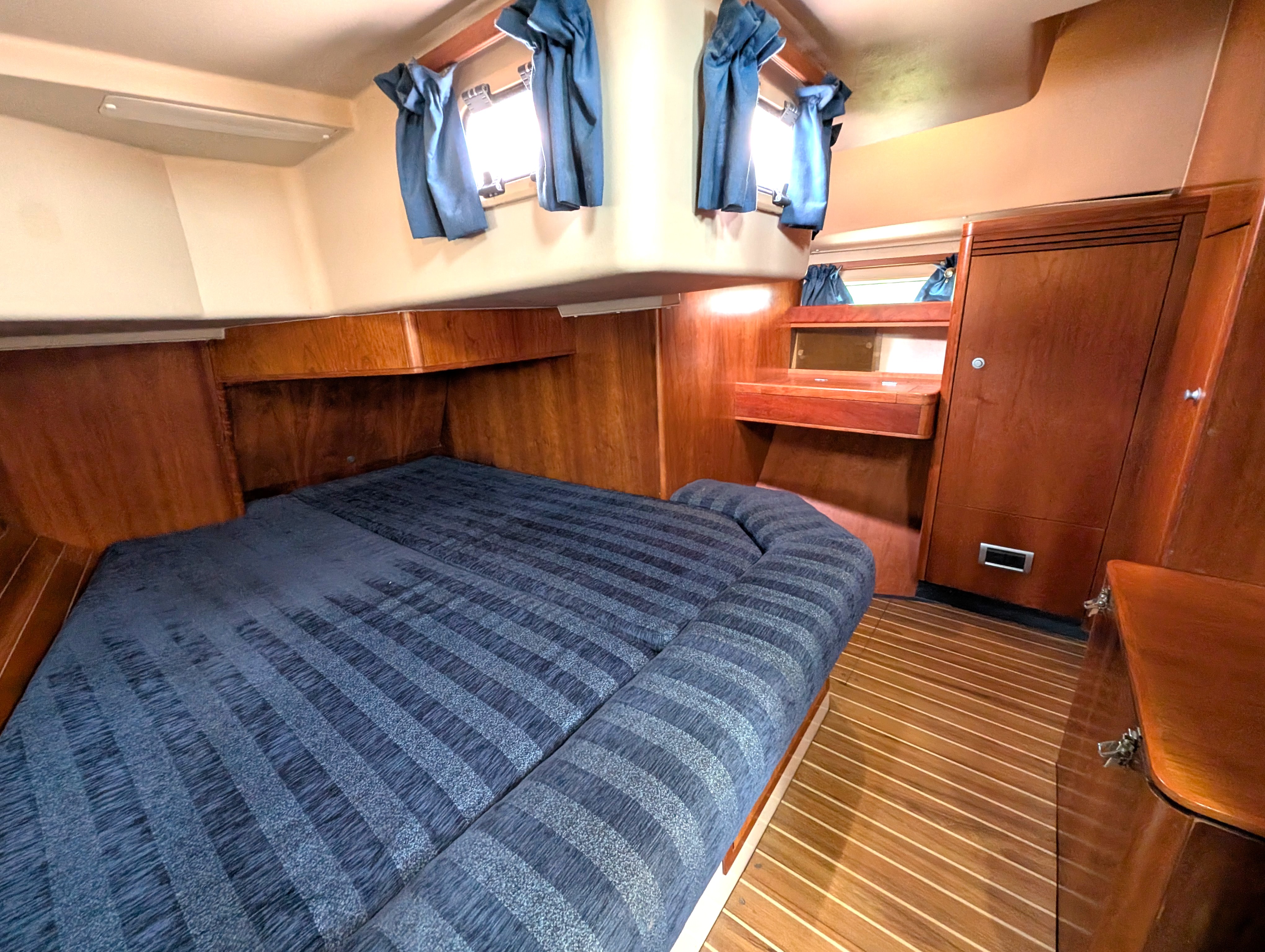 Double V-berth plus hanging storage, lockers and hatches / vent, curtains and blinds