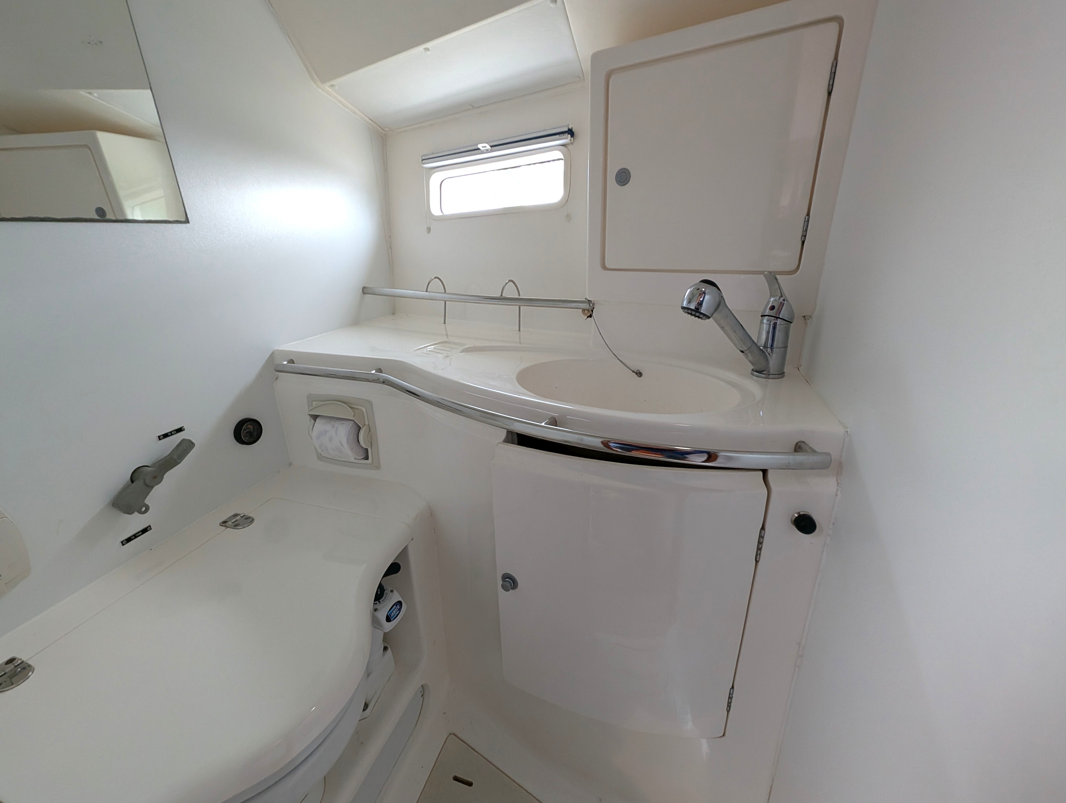 Forward and to port with manual sea toilet, basin and shower