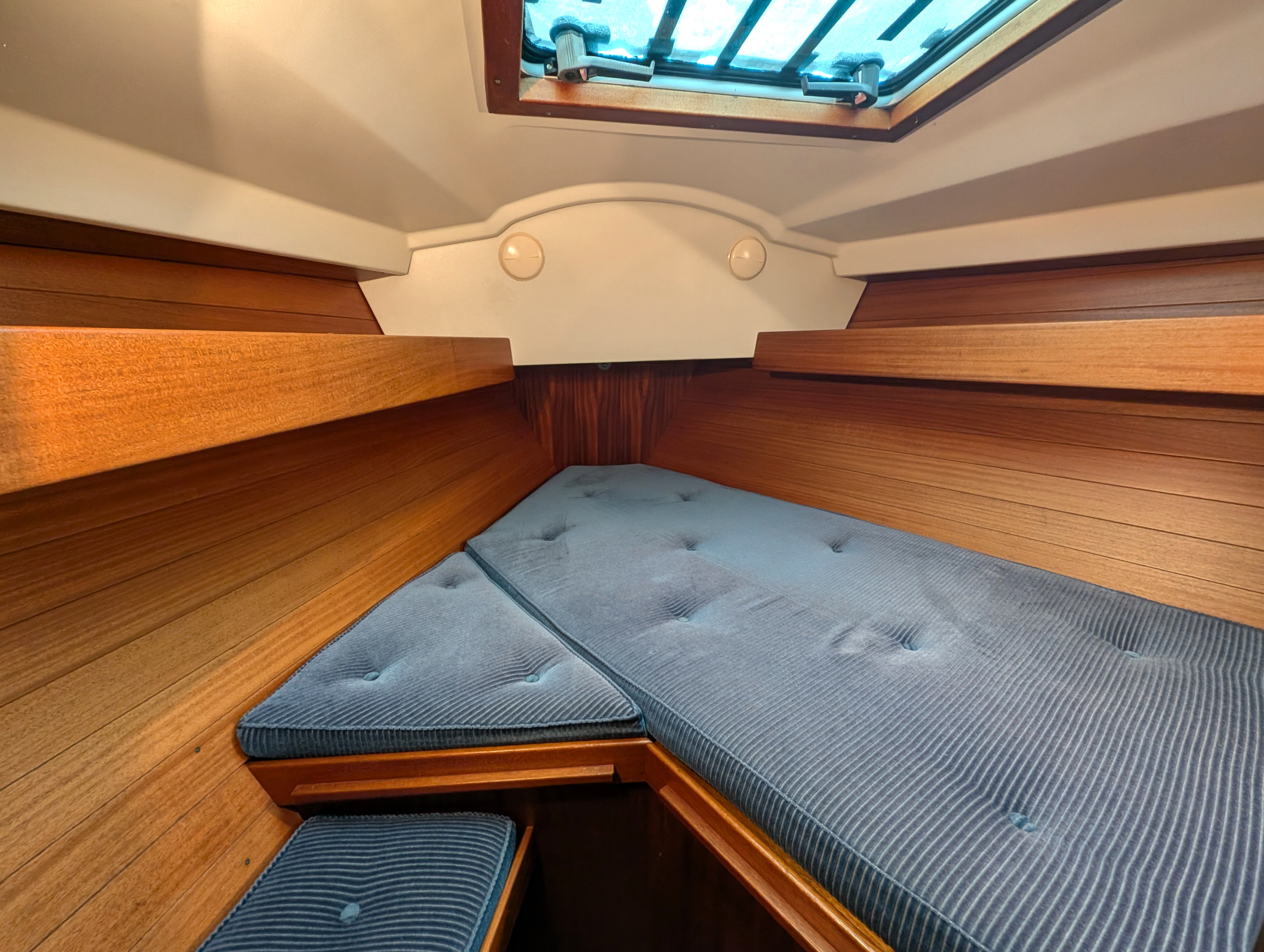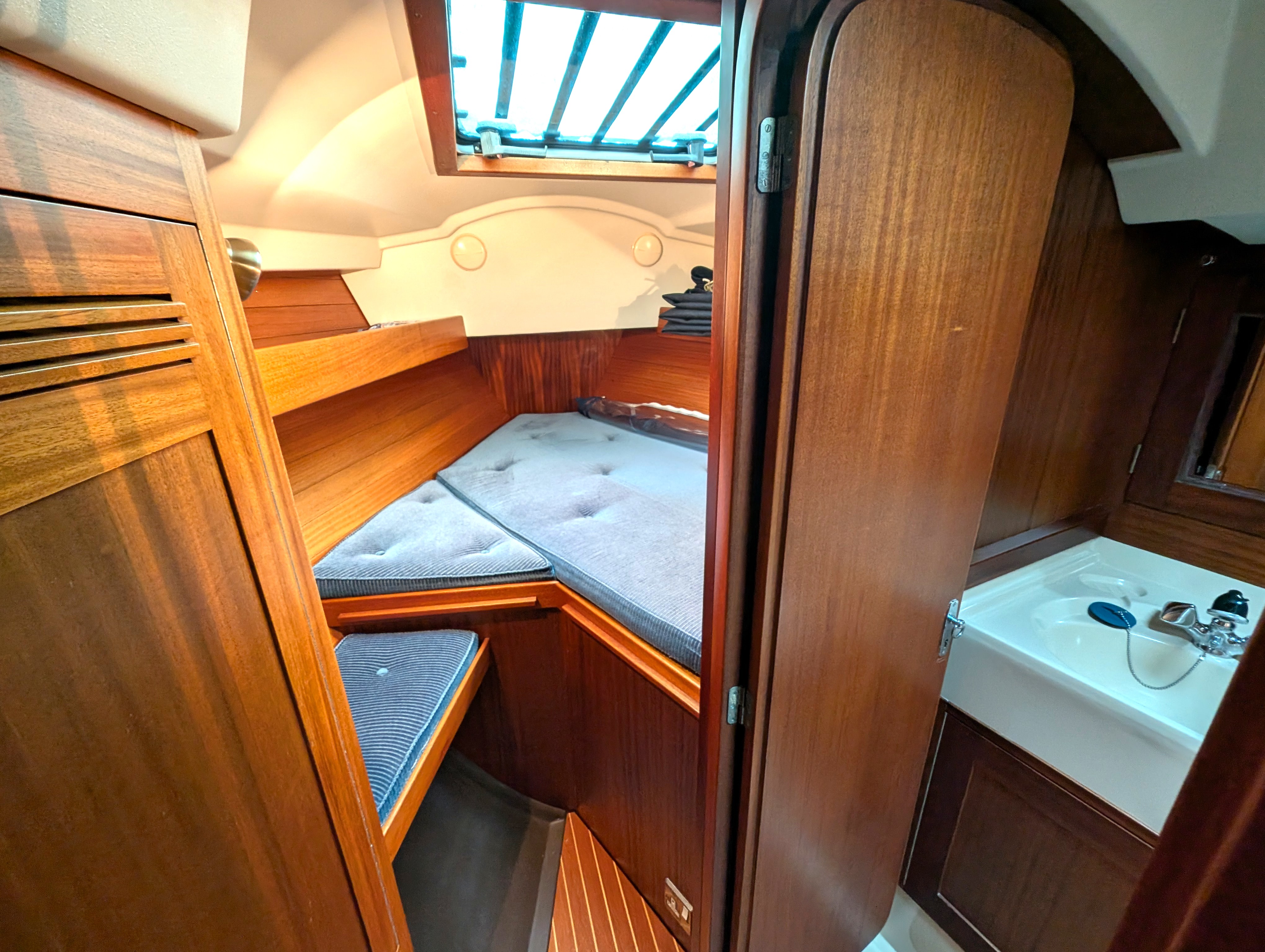 Double aft cabin to starboard, two berths in saloon, twin V berths with infill to form double berth in fore cabin.