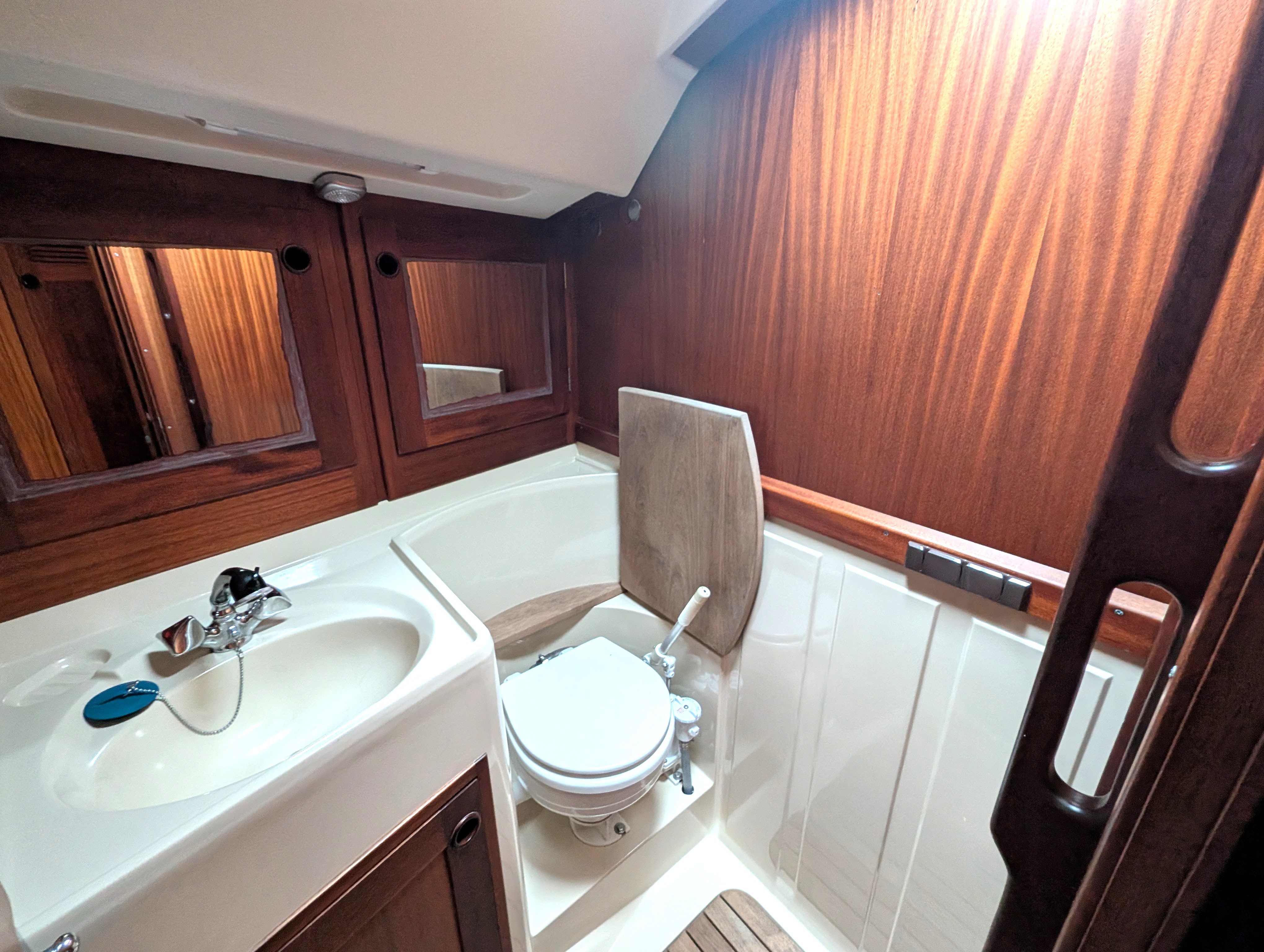 Heads compartment with sea toilet, handbasin and pull out shower.