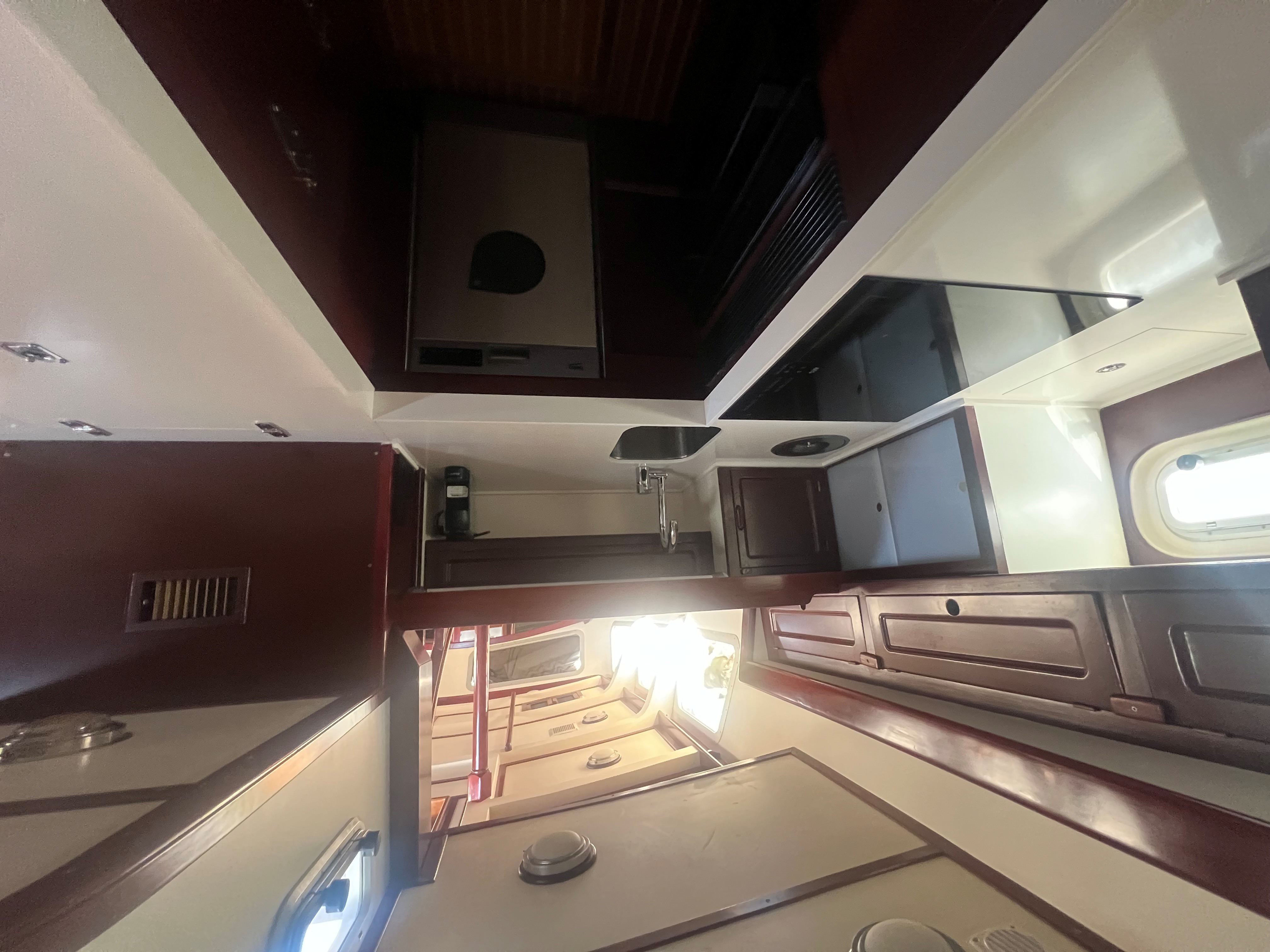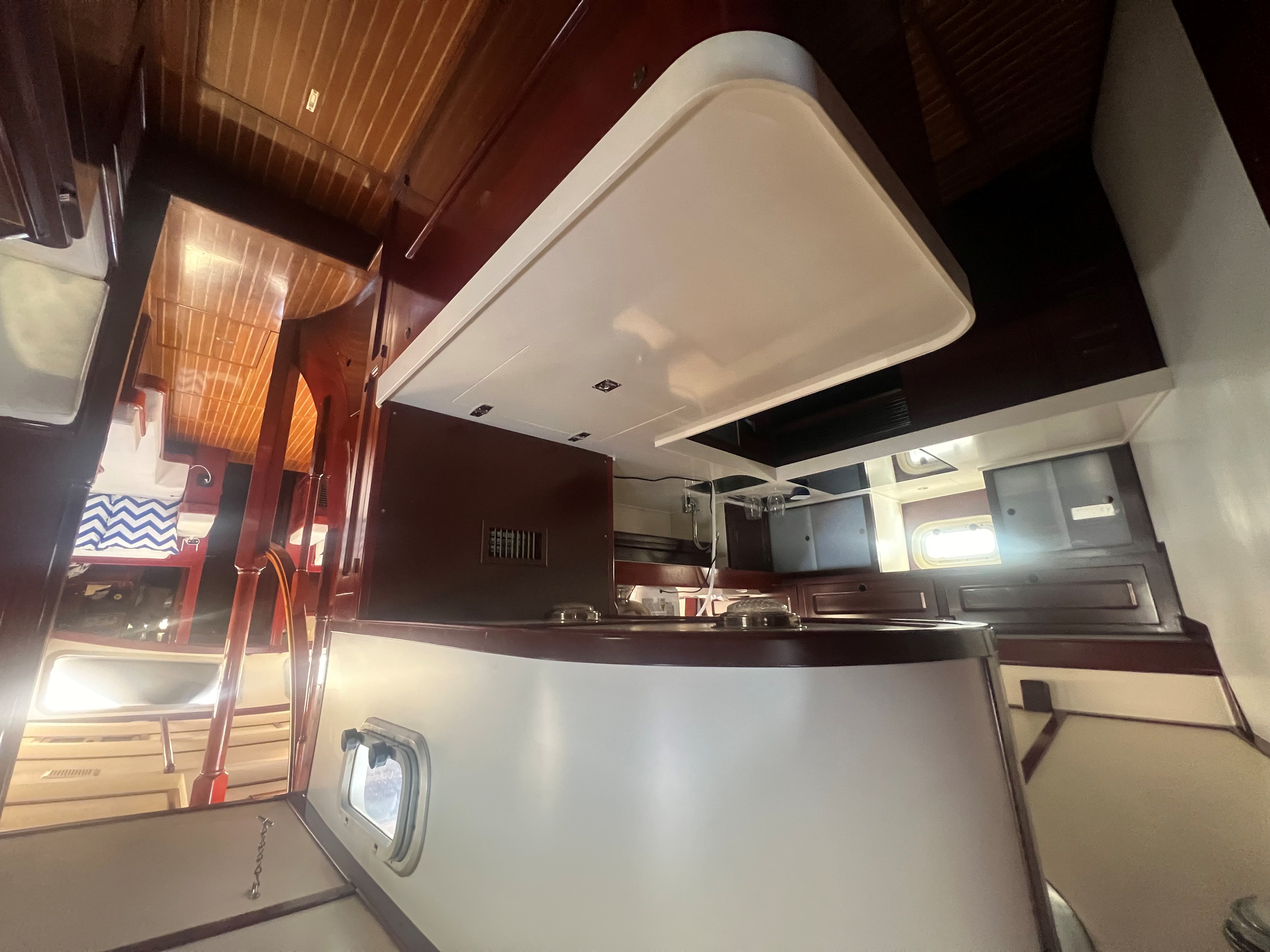 Located adjacent to the companionway and designed for safe, practical use at sea, the U-shaped galley is well-equipped with deep stainless-steel sinks, gimballed stove/oven, microwave, fridge/freezer, and ample countertop and locker space.