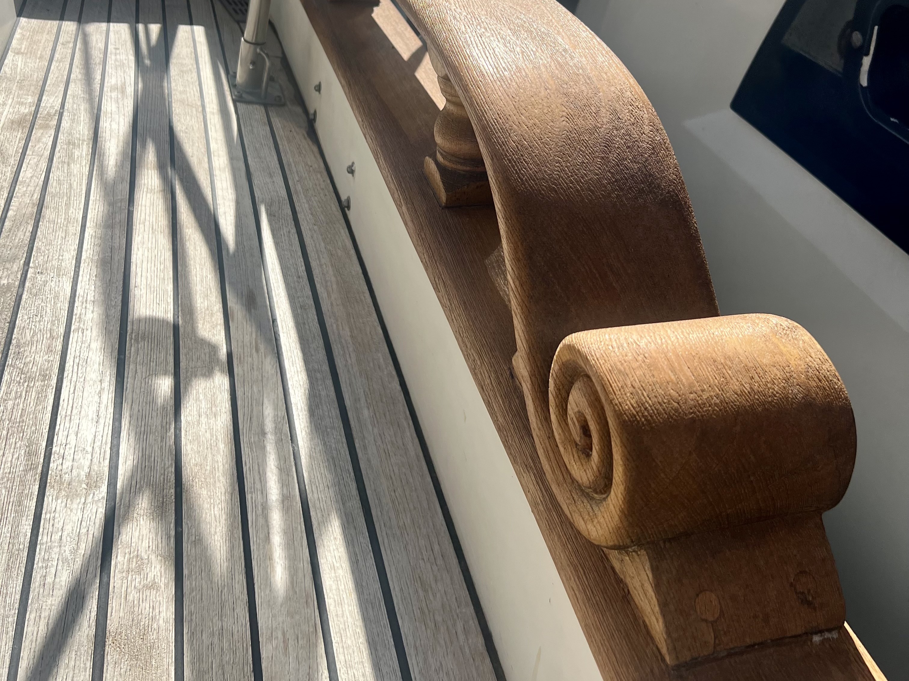 The craftsmanship throughout features beautifully varnished teak joinery, generous natural light, and excellent headroom.
