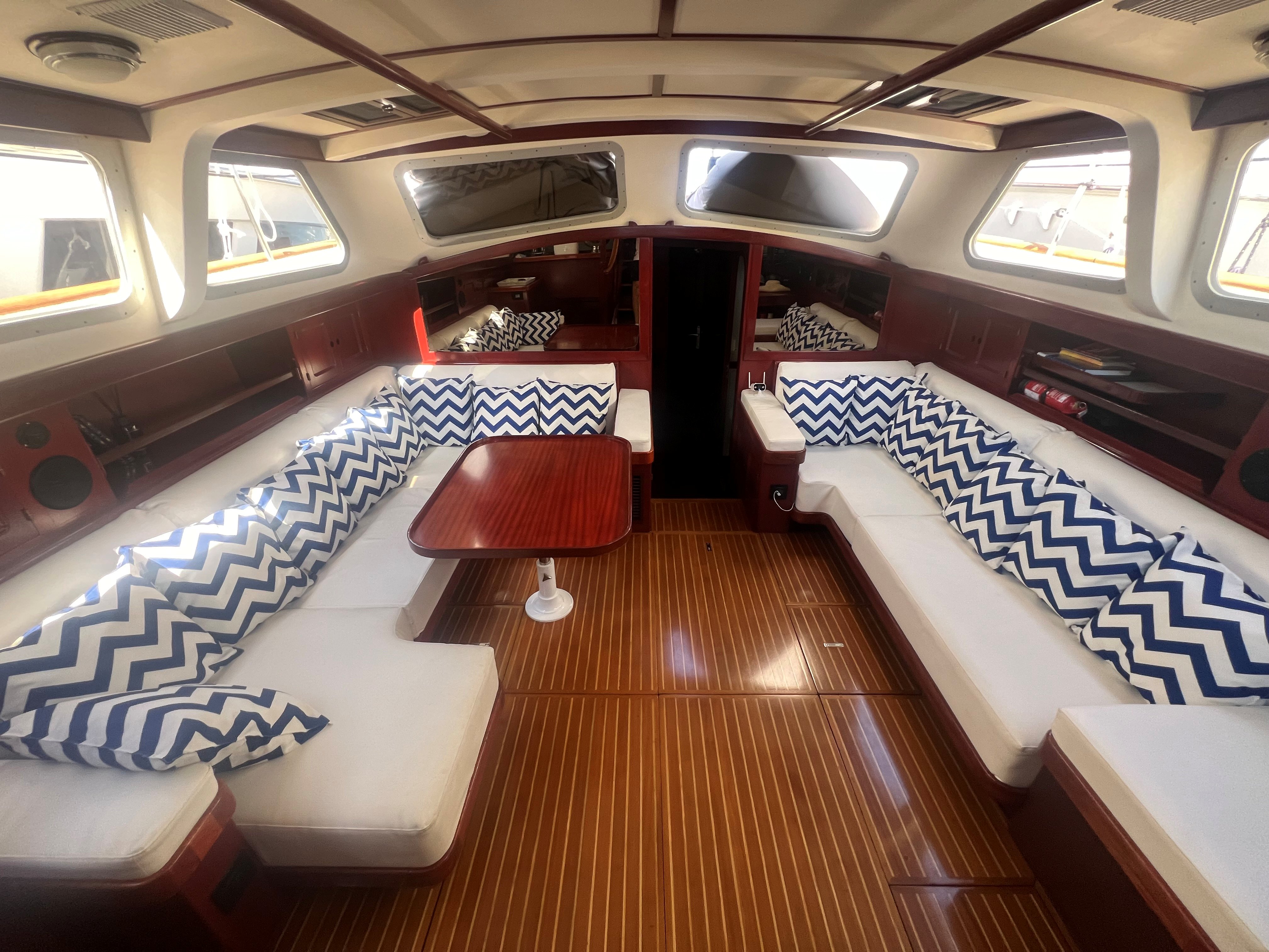 Amidships, the main saloon offers a U-shaped settee and dining table to port, with an additional settee or storage area to starboard.