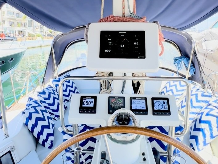 Raymarine navigation system throughout with plotter in cockpit and at chart table.