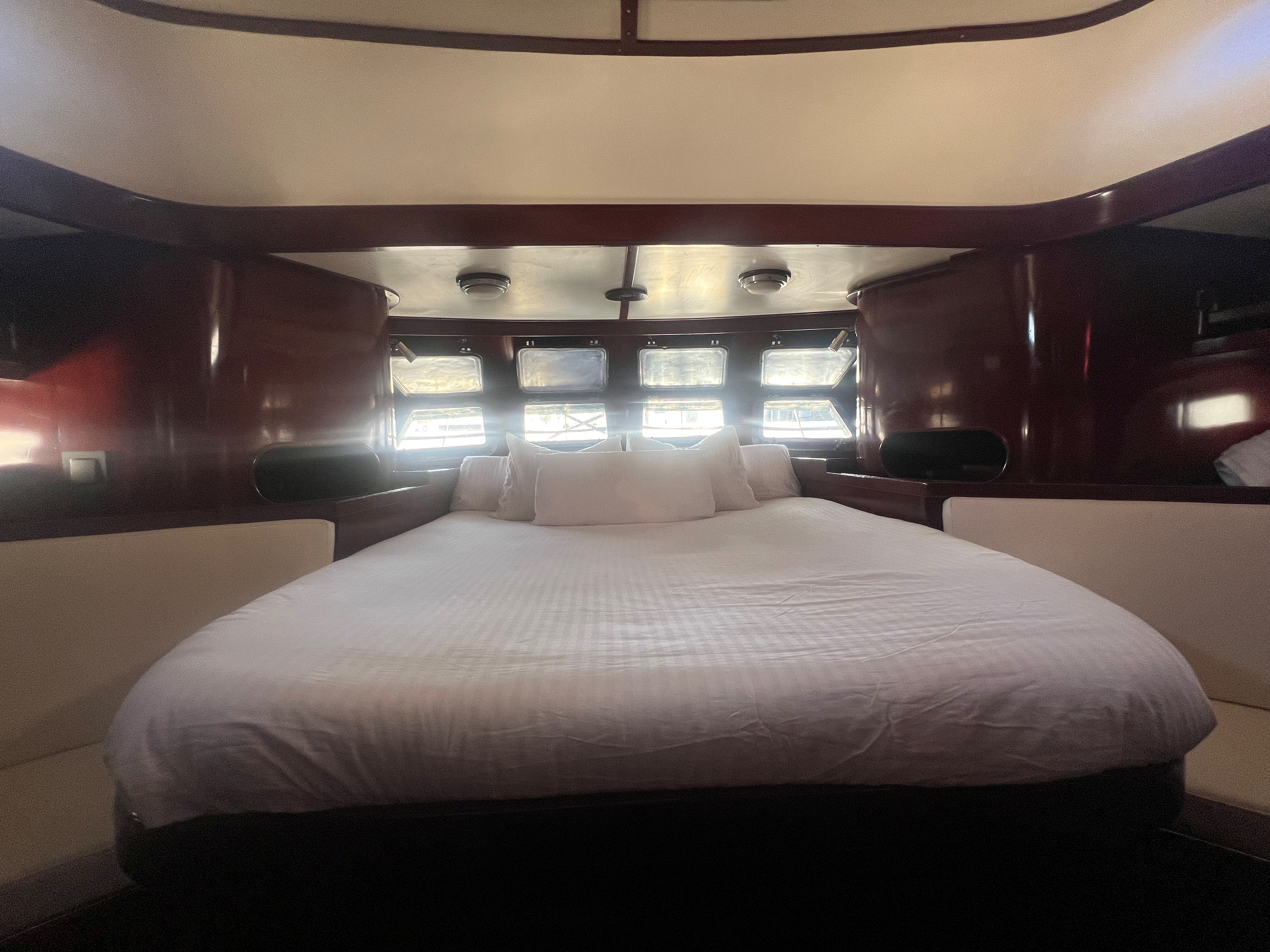 The full-beam owner’s stateroom features a queen-sized island berth, abundant wardrobe and locker storage, and a comfortable seating area.